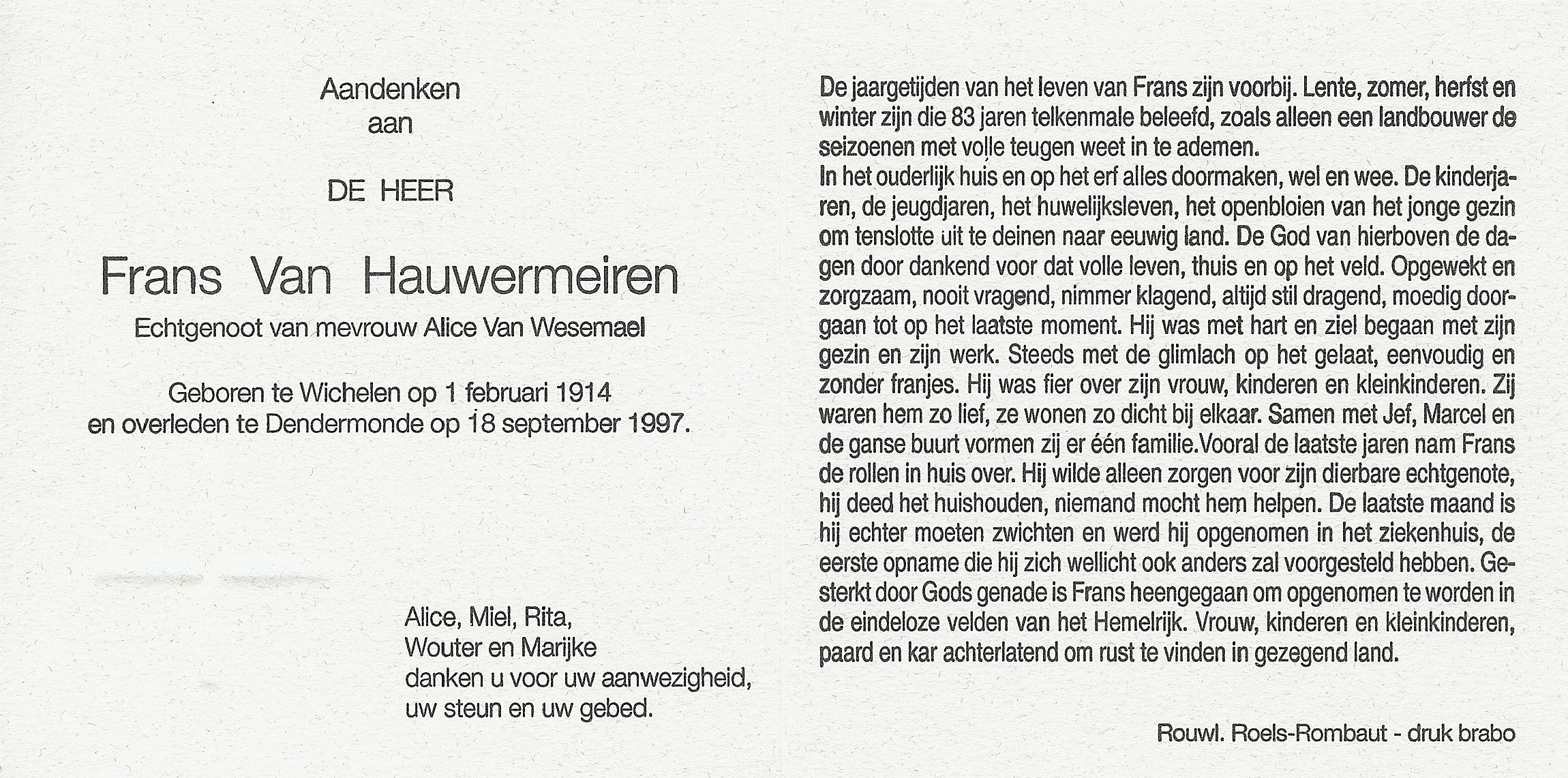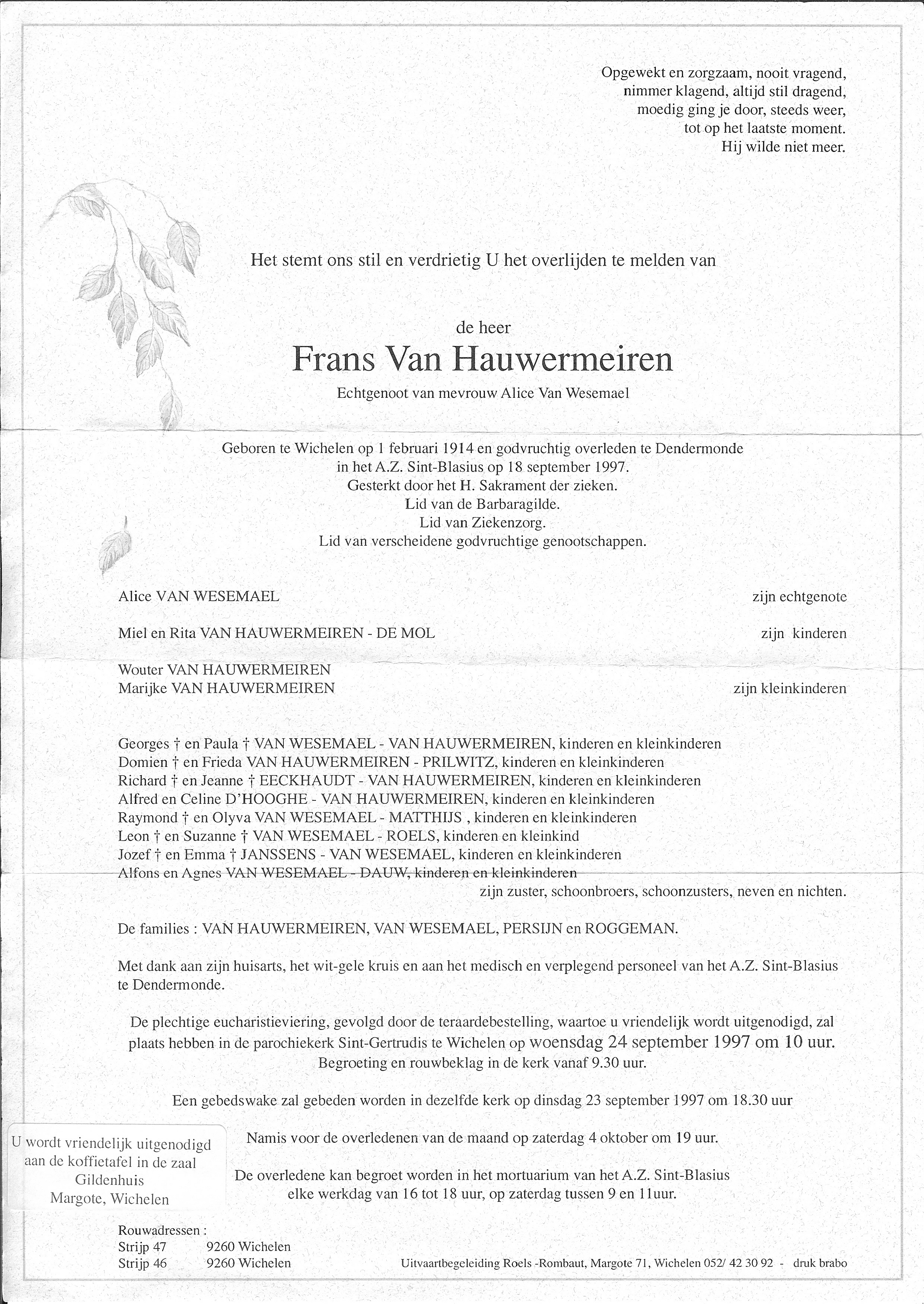Franciscus Van Hauwermeiren Geboren: 1 februari 1914 35 26 — Wichelen Overleden: 18 september 1997 — Dendermonde |
