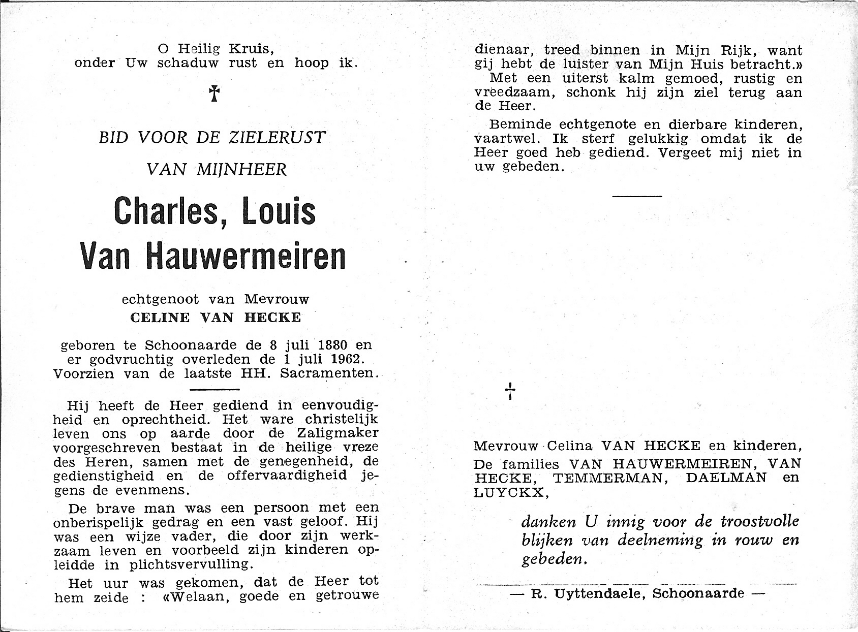 Carolus Ludovicus Van Hauwermeiren Geboren: 8 juli 1880 40 33 — Schoonaarde Overleden: 1 juli 1962 — Schoonaarde |
