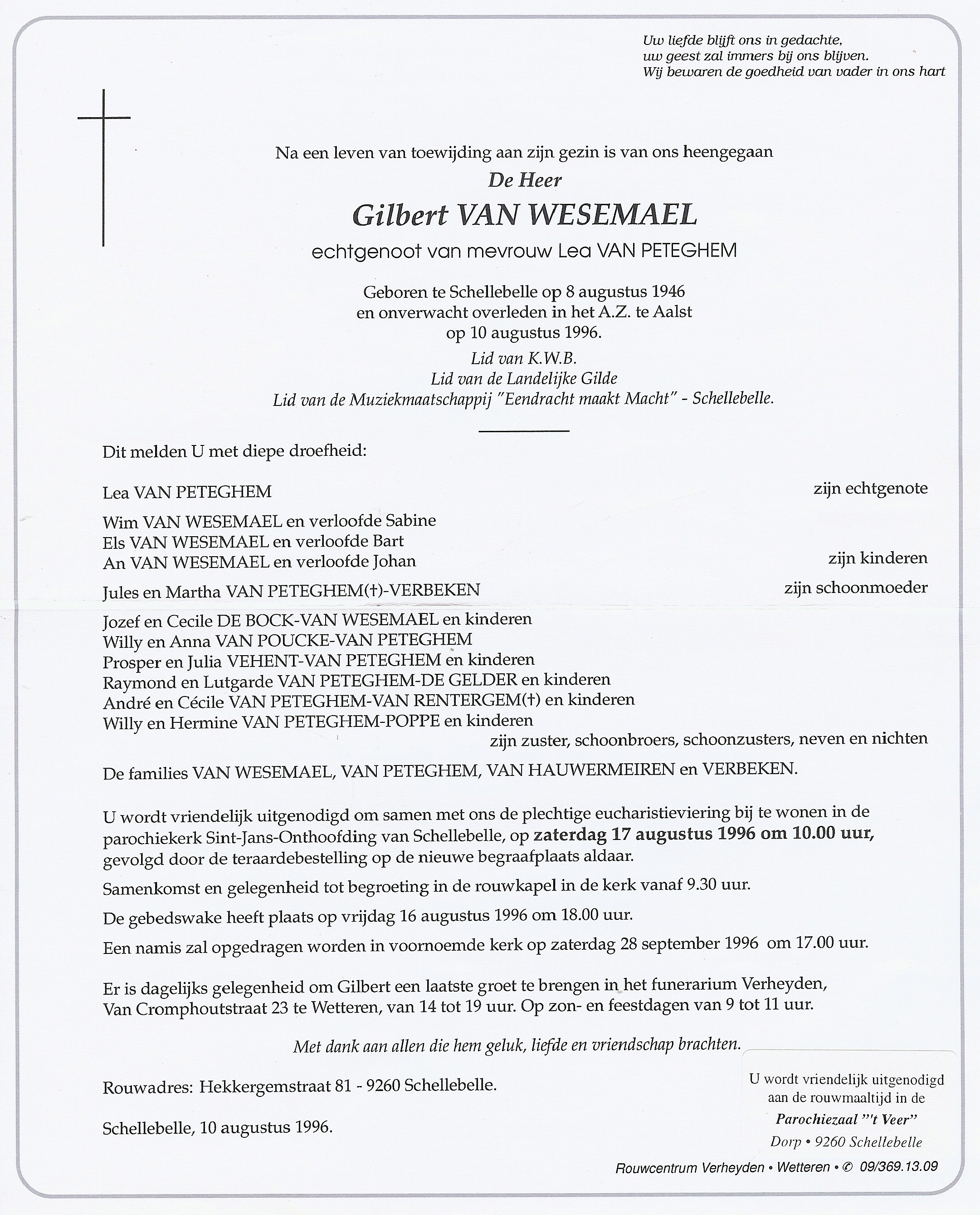 Gilbert Emiel Jean Van Wesemael Geboren: 8 augustus 1946 40 35 — Schellebelle Overleden: 10 augustus 1996 — Aalst |