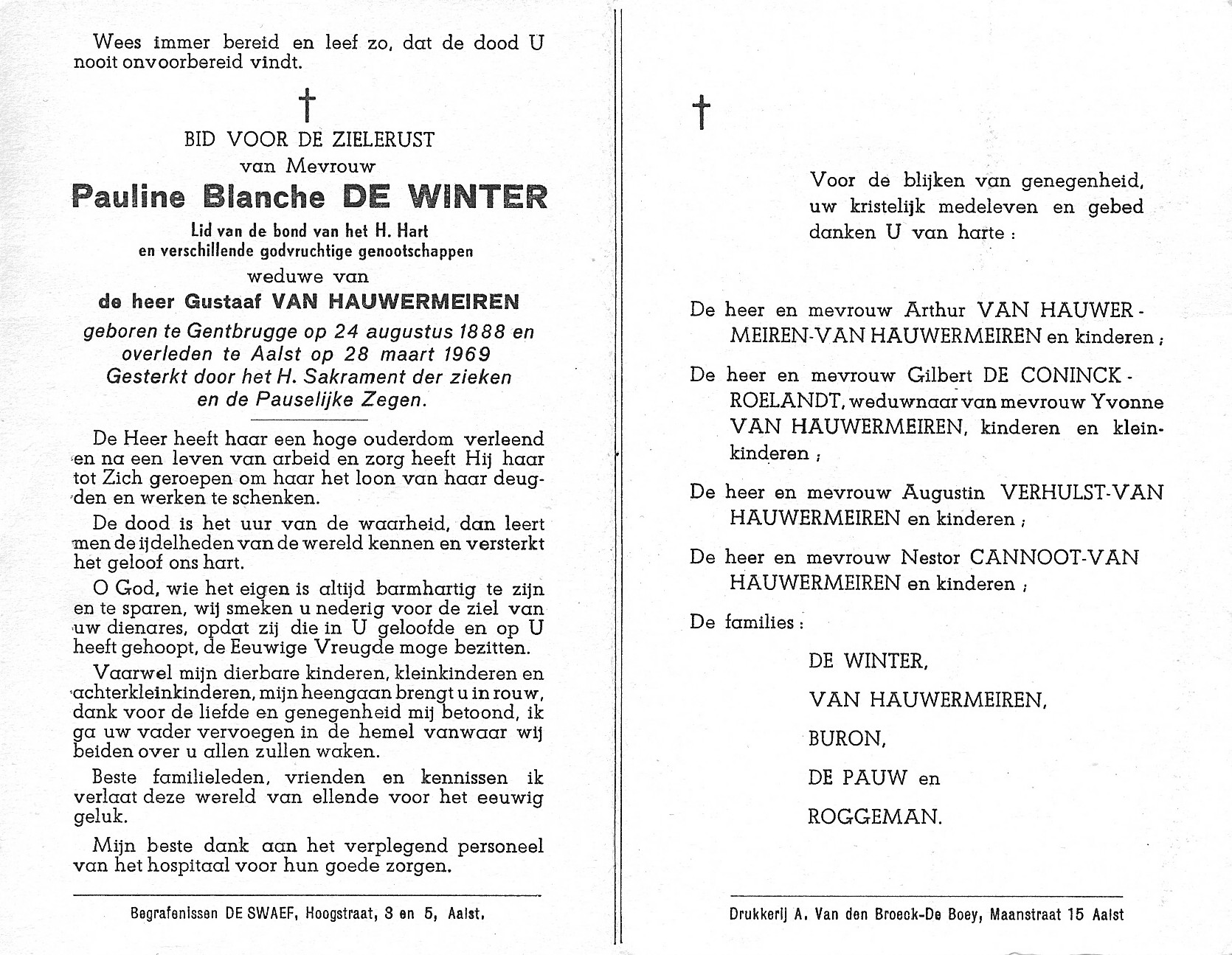 Pauline-Blanche De Winter Geboren: 24 augustus 1888 — Gentbrugge Overleden: 28 maart 1969 — Aalst |