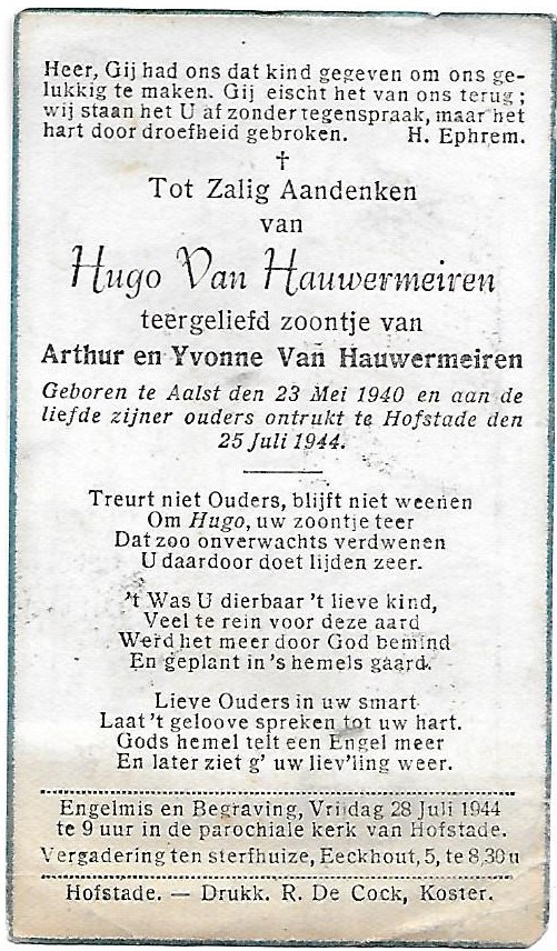 Overlijden van een kleinzoon | Hugo Van Hauwermeiren 25 juli 1944 (Leeftijd 55 jaar) |