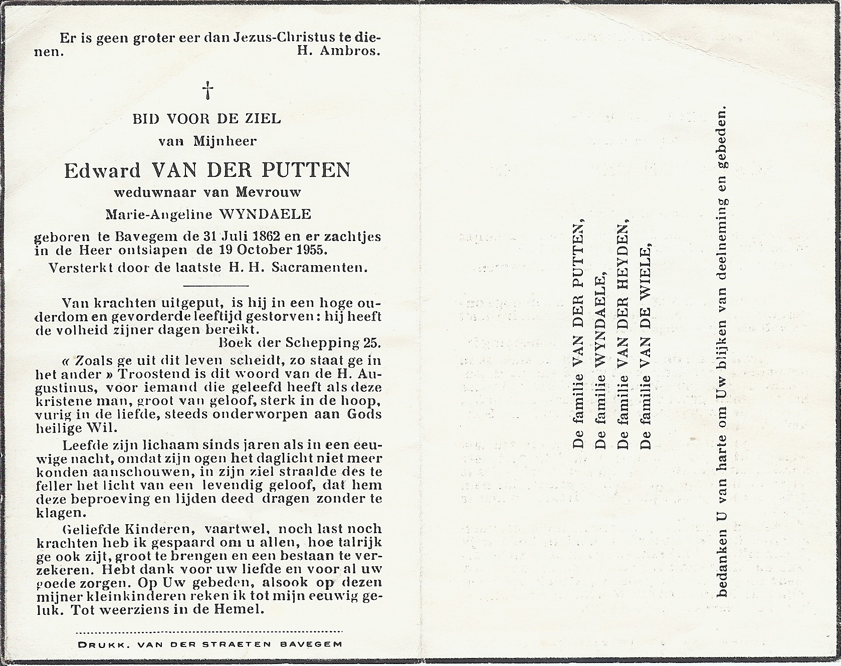 Edwardus Van Der Putten Geboren: 31 juli 1862 42 44 — Bavegem Overleden: 19 oktober 1955 — Bavegem |
