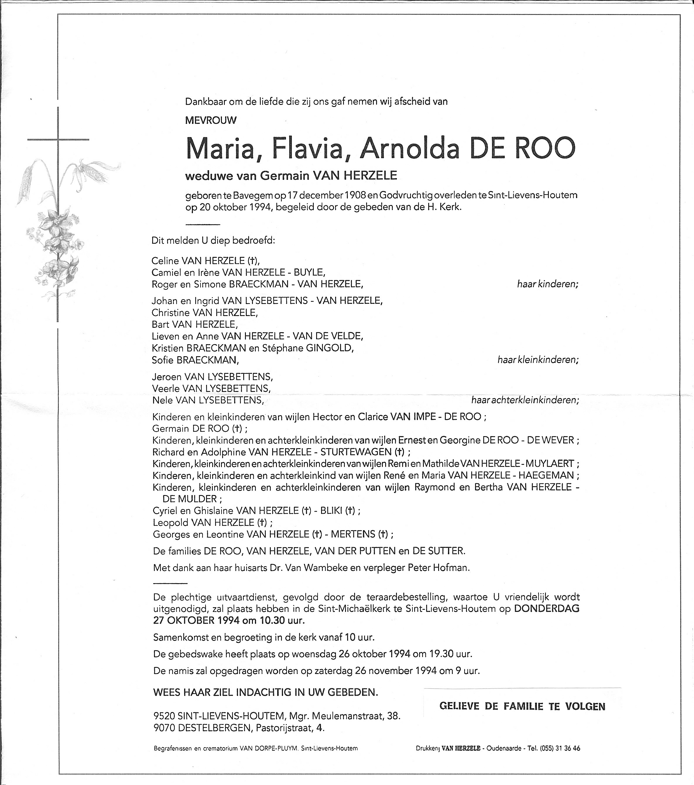 Maria Flavia Arnolda De Roo Geboren: 17 december 1908 28 25 — Bavegem Overleden: 20 oktober 1994 — Sint-Lievens-Houtem |
