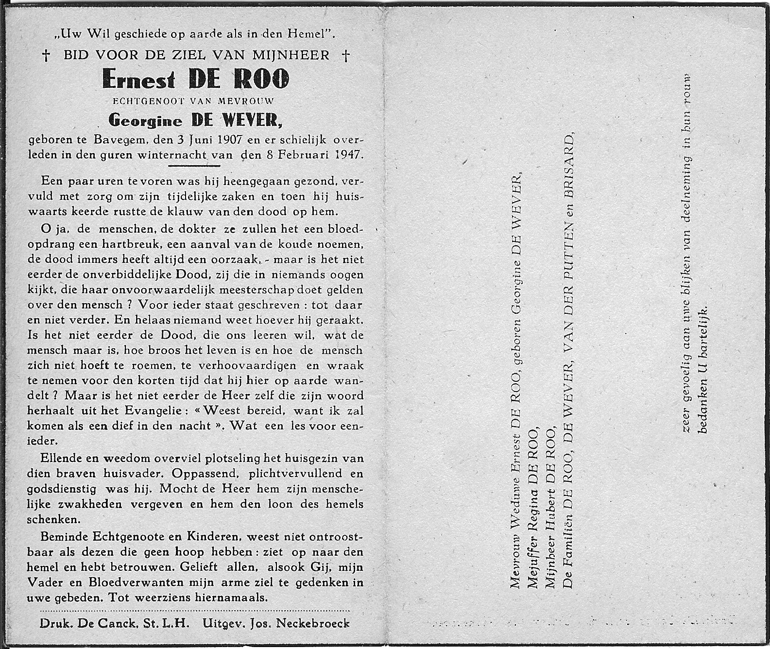 Overlijden van een broer | Ernest De Roo 8 februari 1947 (Leeftijd 38 jaar) |