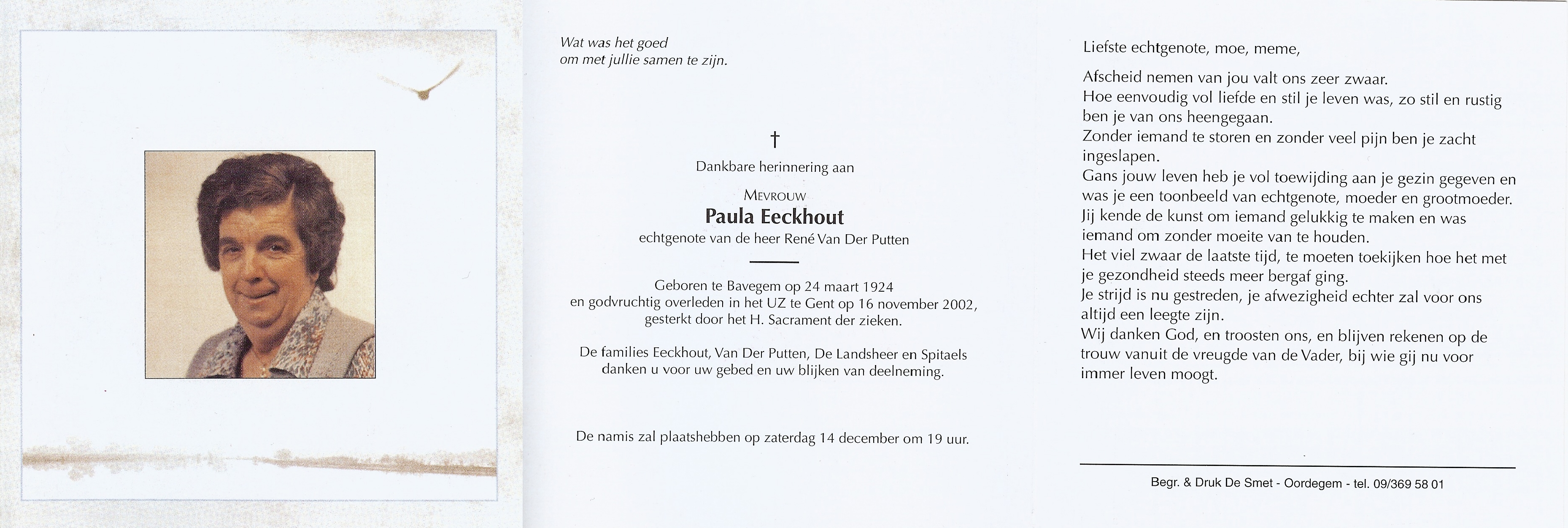 Begrafenis van een echtgenote | Paula Gabriella Eeckhout 23 november 2002 (Leeftijd 78 jaar) |