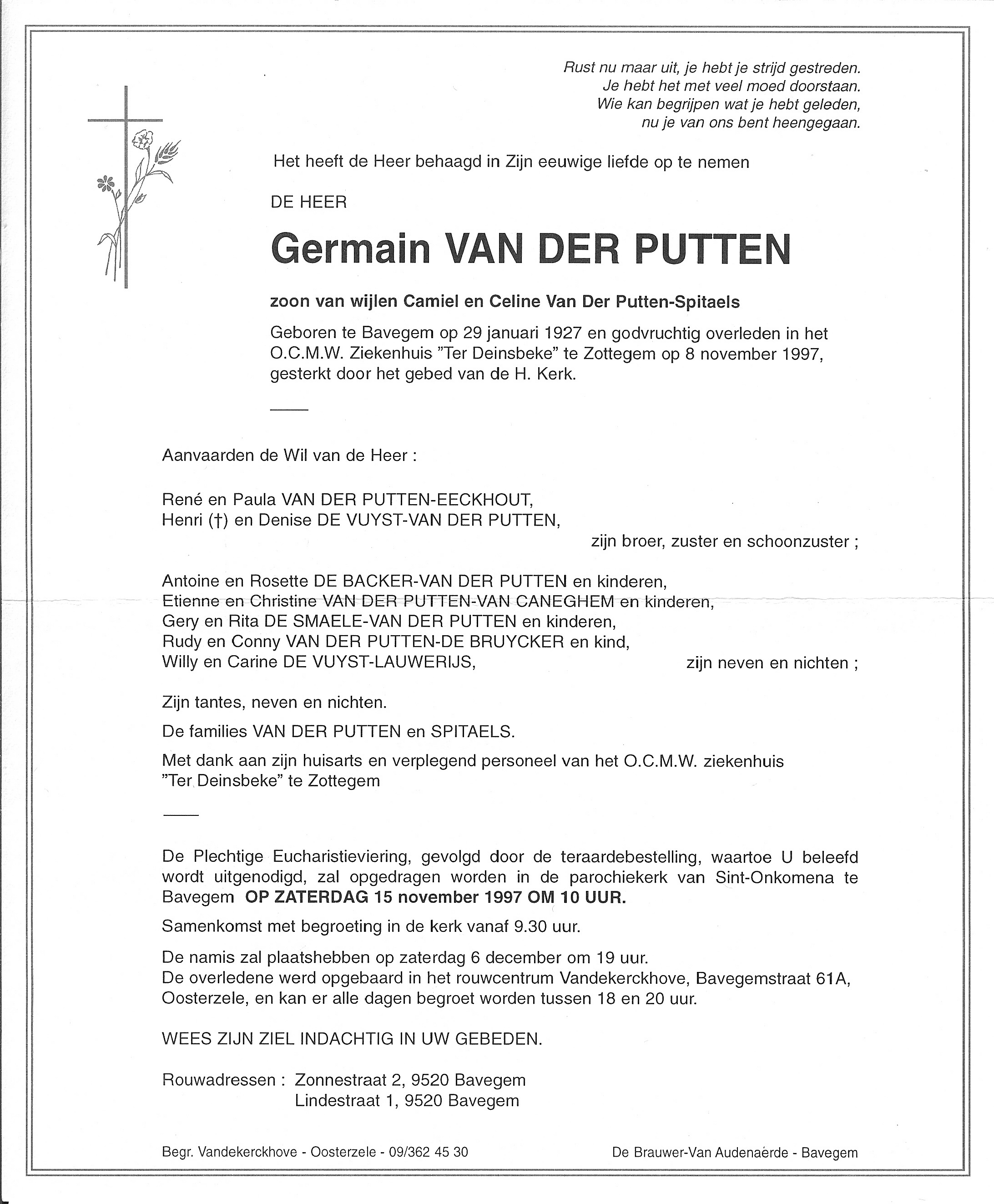 Begrafenis van een broer | Germain Van Der Putten 15 november 1997 (Leeftijd 73 jaar) |