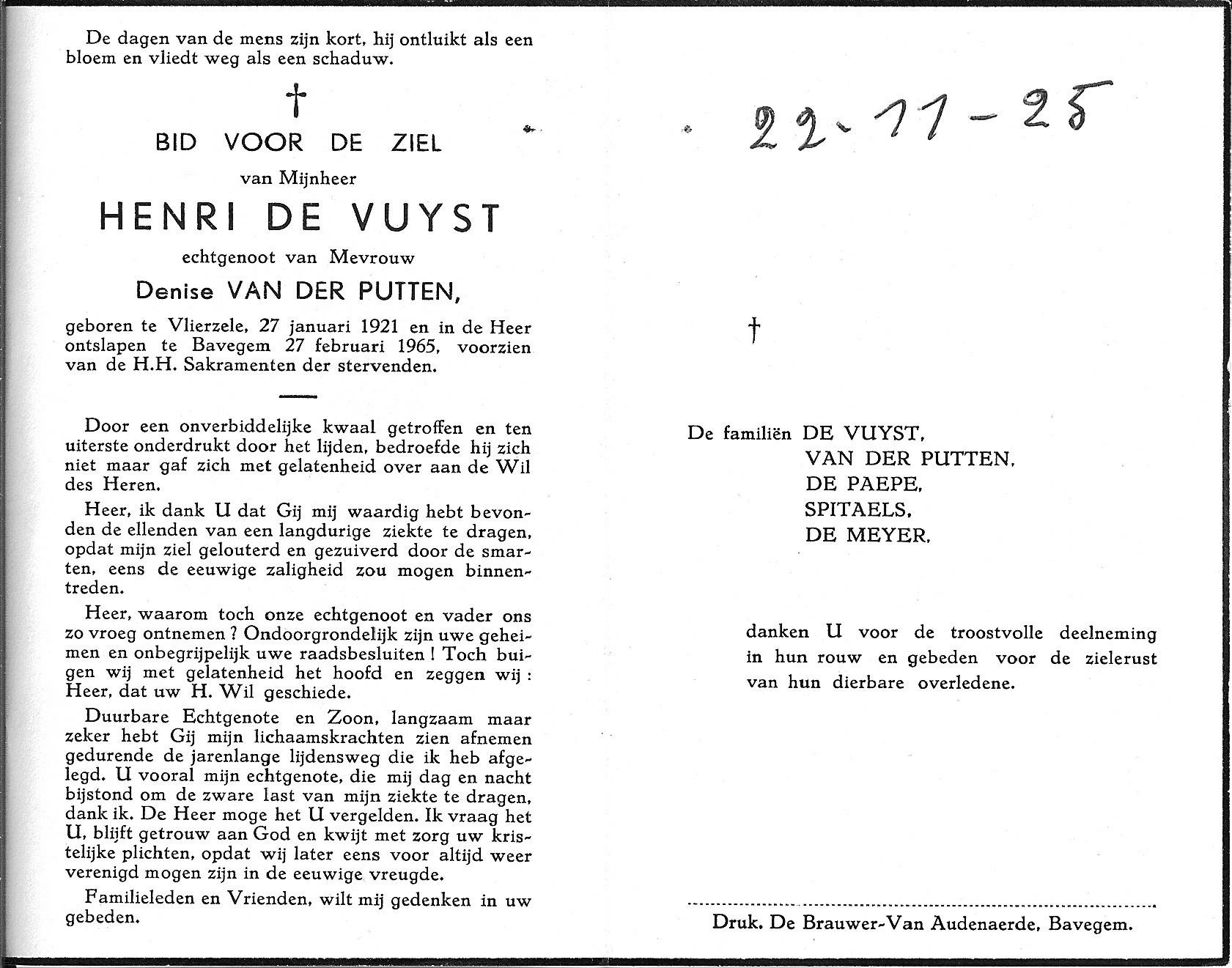 Henri De Vuyst Geboren: 27 januari 1921 — Vlierzele Overleden: 27 februari 1965 — Bavegem |