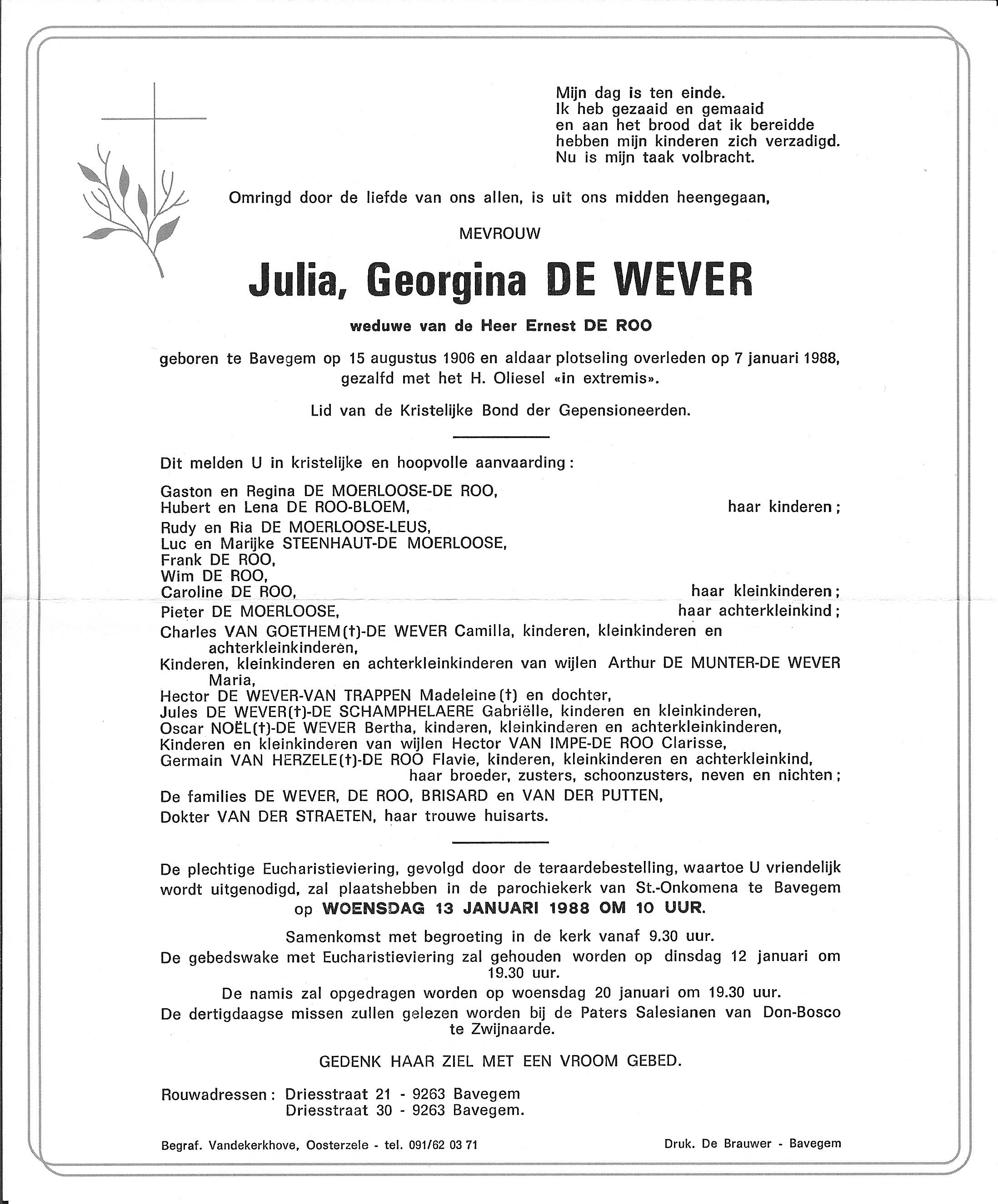 Julia Georgina De Wever Geboren: 15 augustus 1906 — Bavegem Overleden: 7 januari 1988 — Bavegem |
