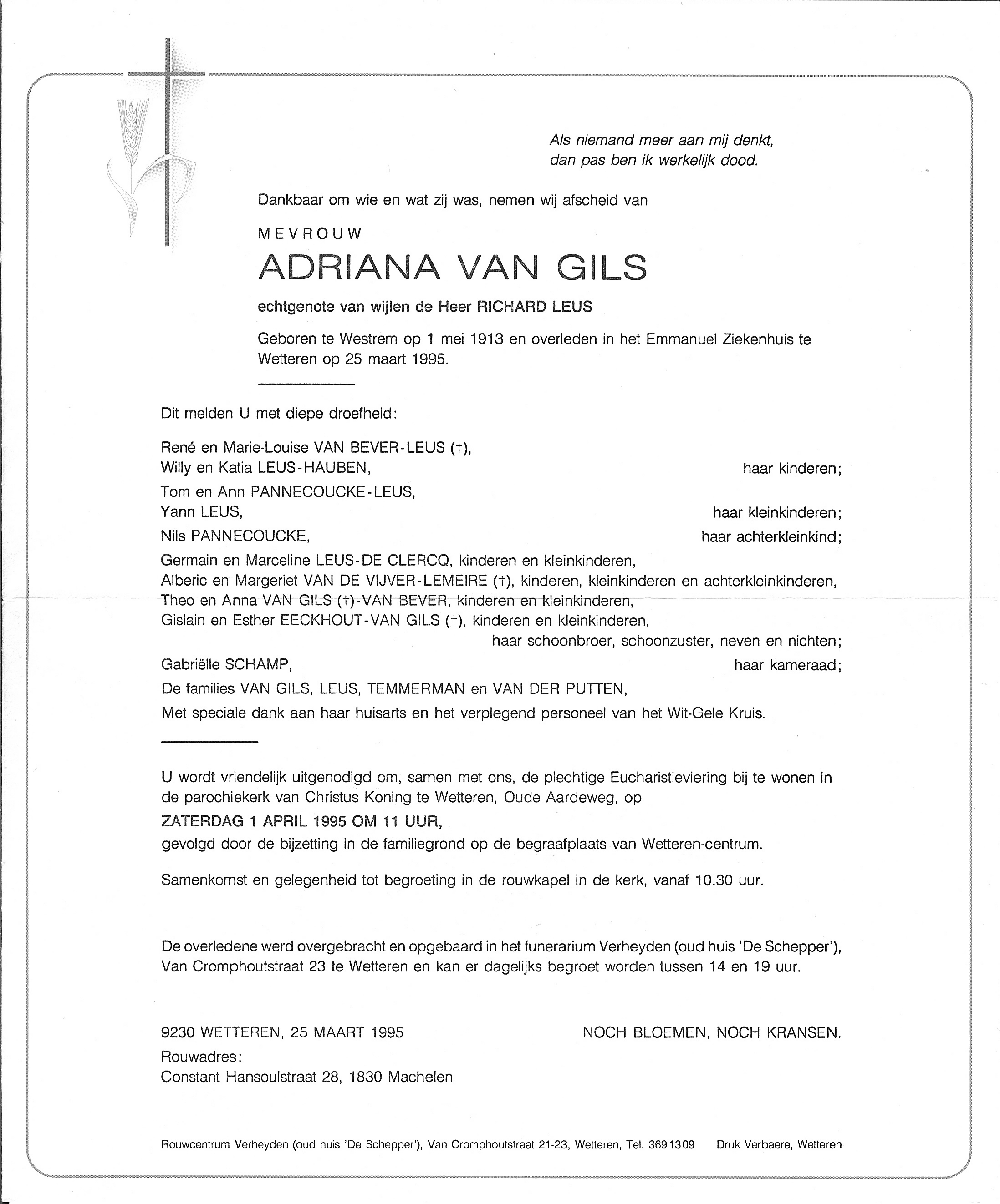 Adriana Van Gils Geboren: 1 mei 1913 — Westrem Overleden: 25 maart 1995 — Wetteren |