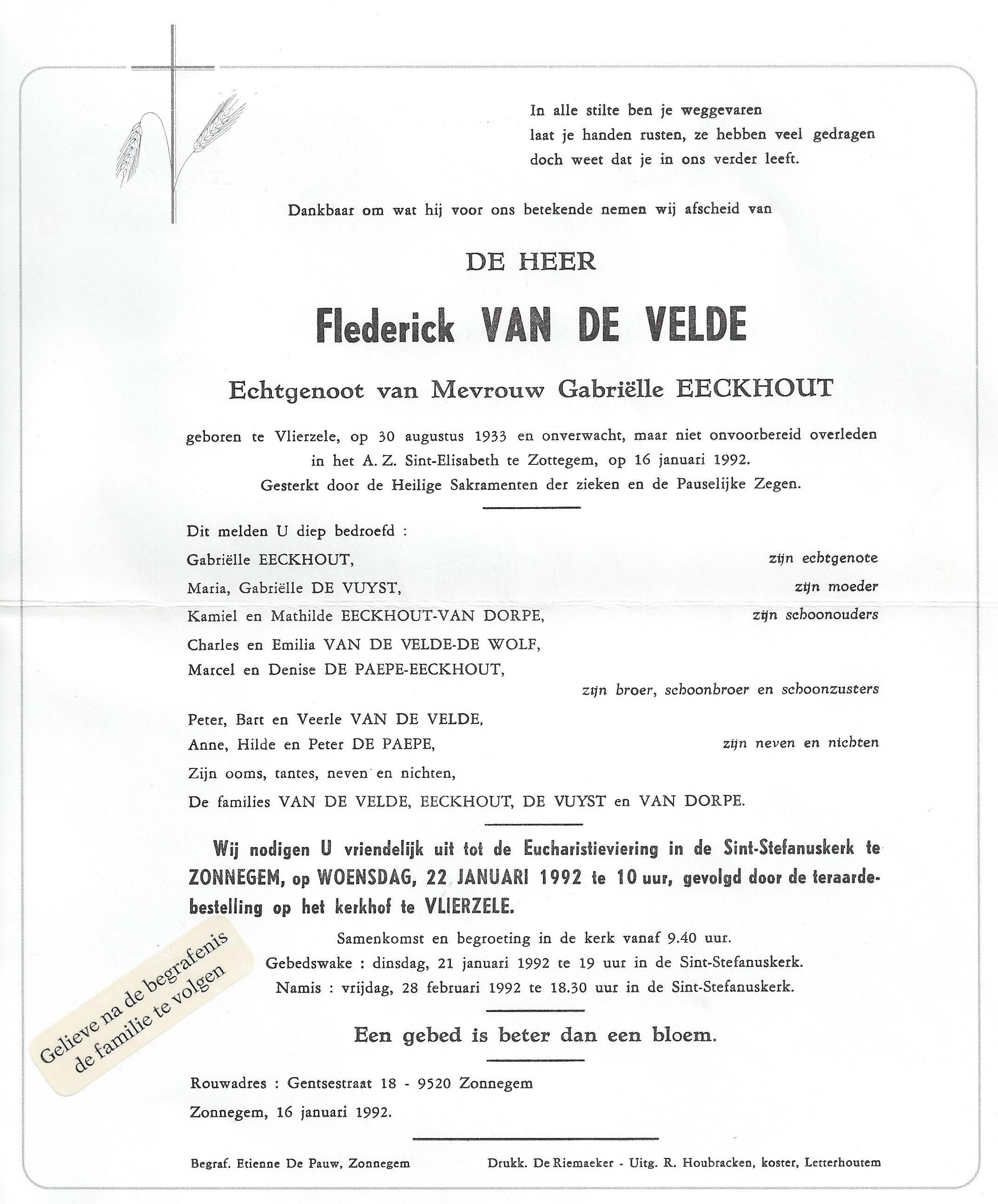 Flederick Van de Velde Geboren: 30 augustus 1933 — Vlierzele Overleden: 16 januari 1992 — Zottegem |