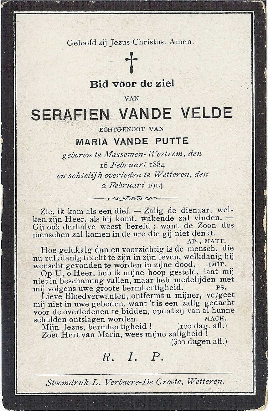 Overlijden van een echtgenoot | Seraphinus Van de Velde 2 februari 1914 (Leeftijd 26 jaar) |