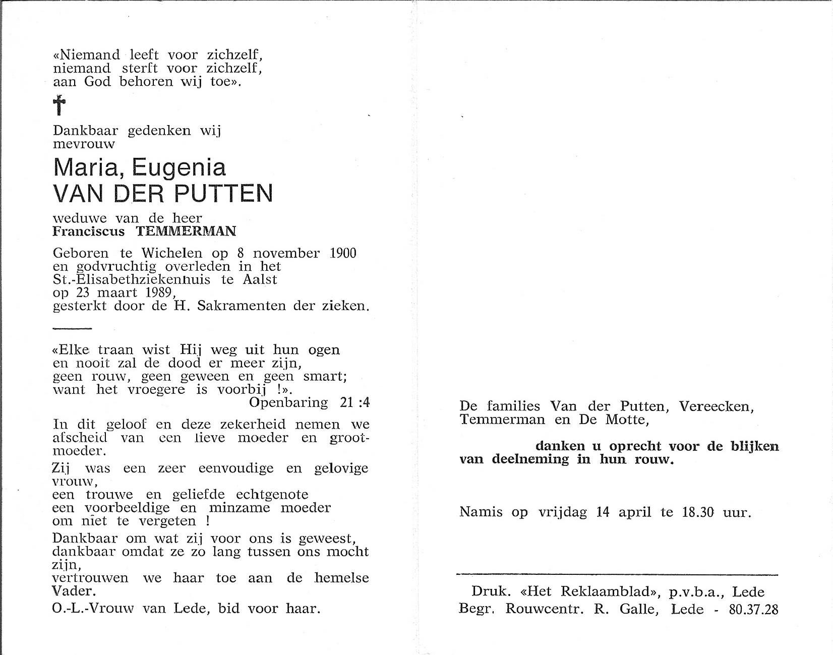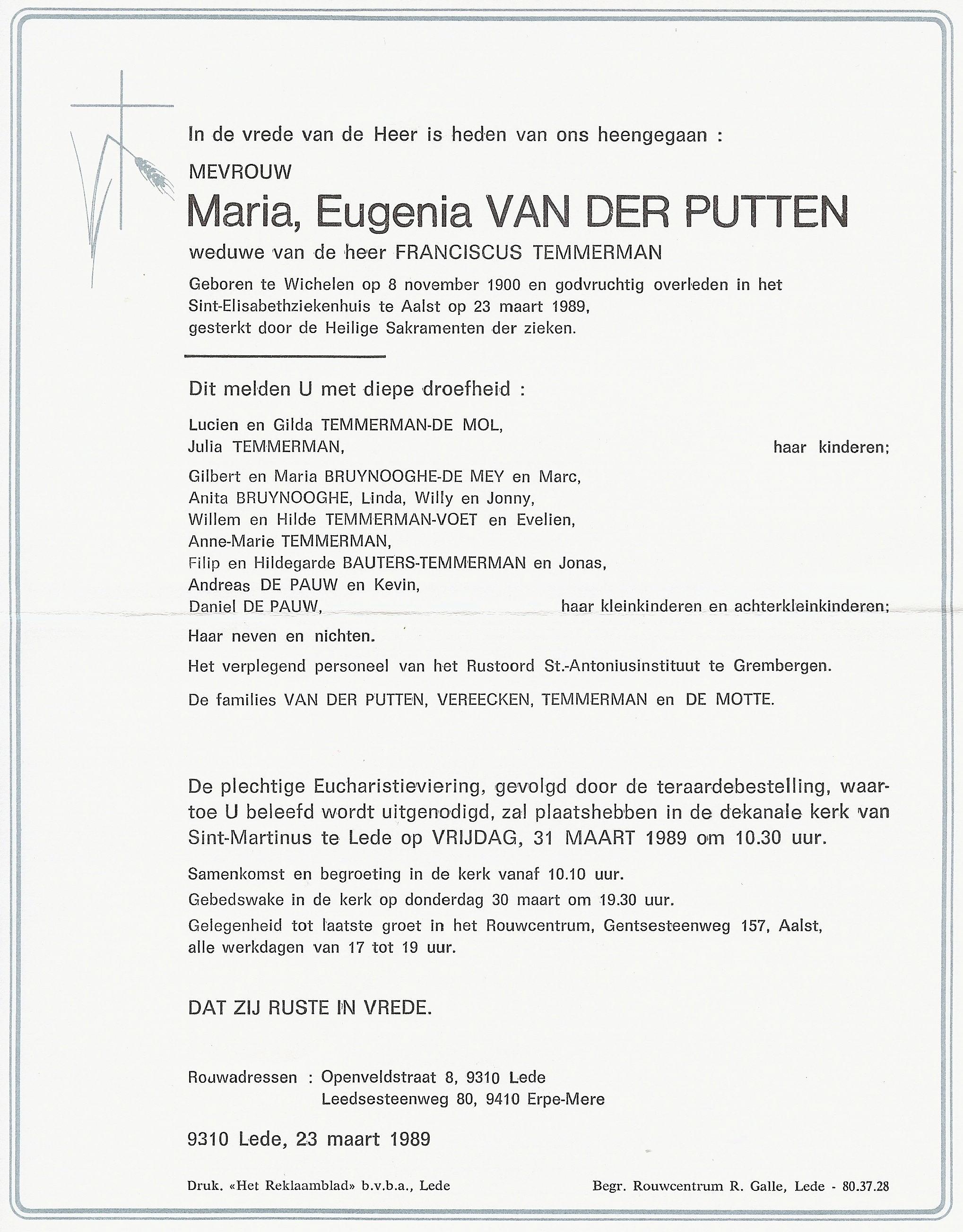 Overlijden van een echtgenoot | Franciscus Xaverius Temmerman 13 november 1980 (Leeftijd 80 jaar) |