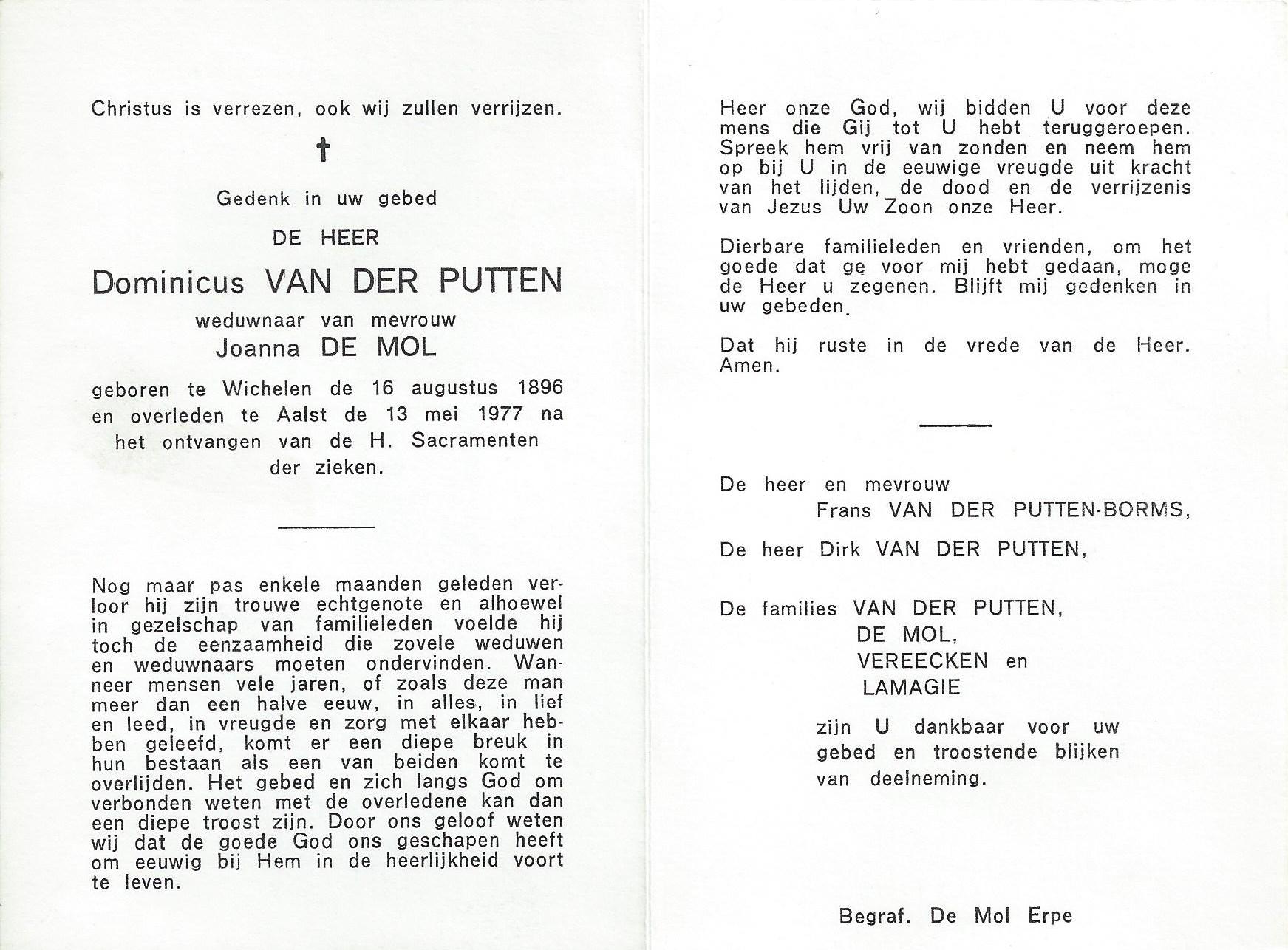 Overlijden van een broer | Dominicus Van der Putten 13 mei 1977 (Leeftijd 76 jaar) |