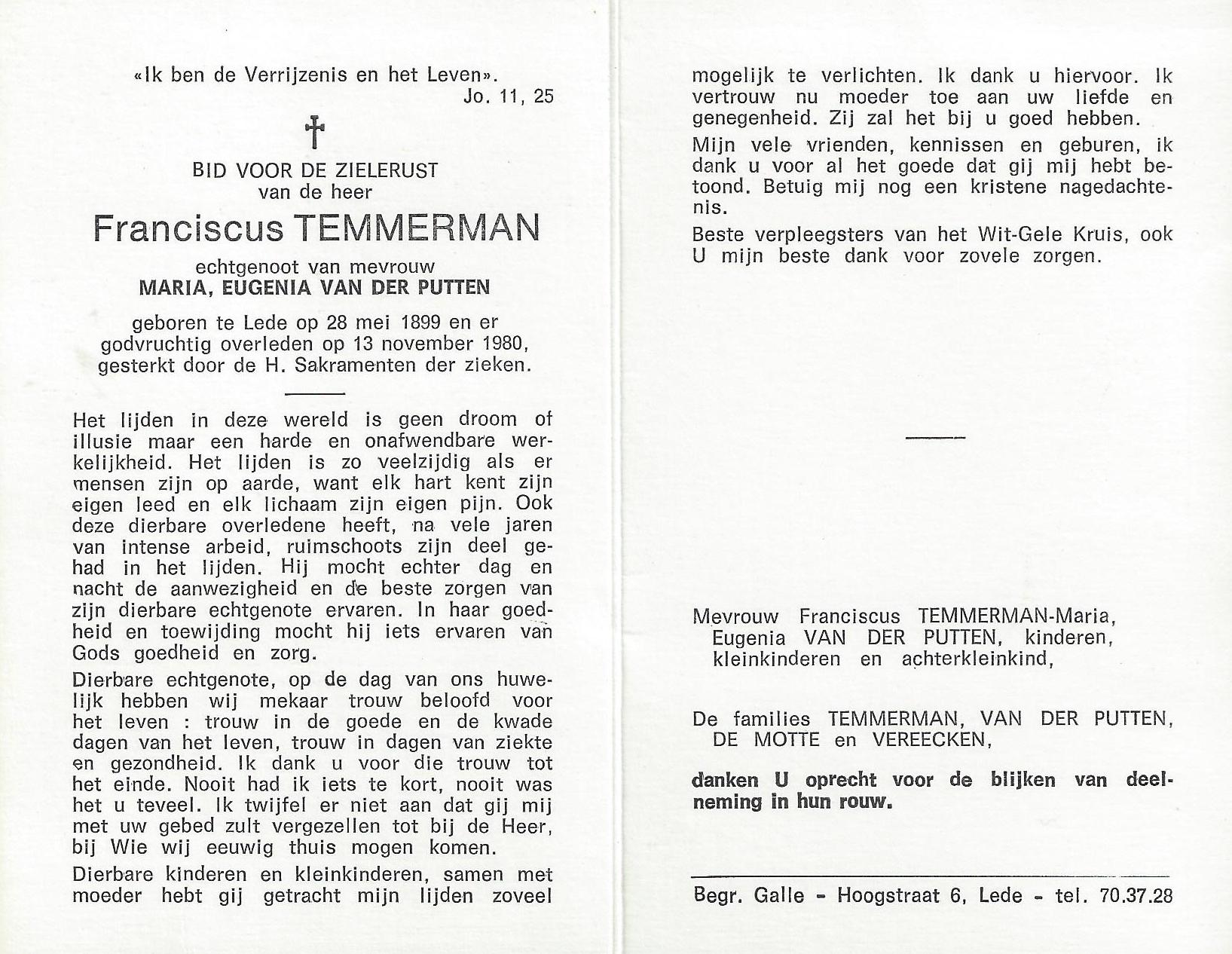 Begrafenis van een echtgenoot | Franciscus Xaverius Temmerman 18 november 1980 (Leeftijd 80 jaar) |
