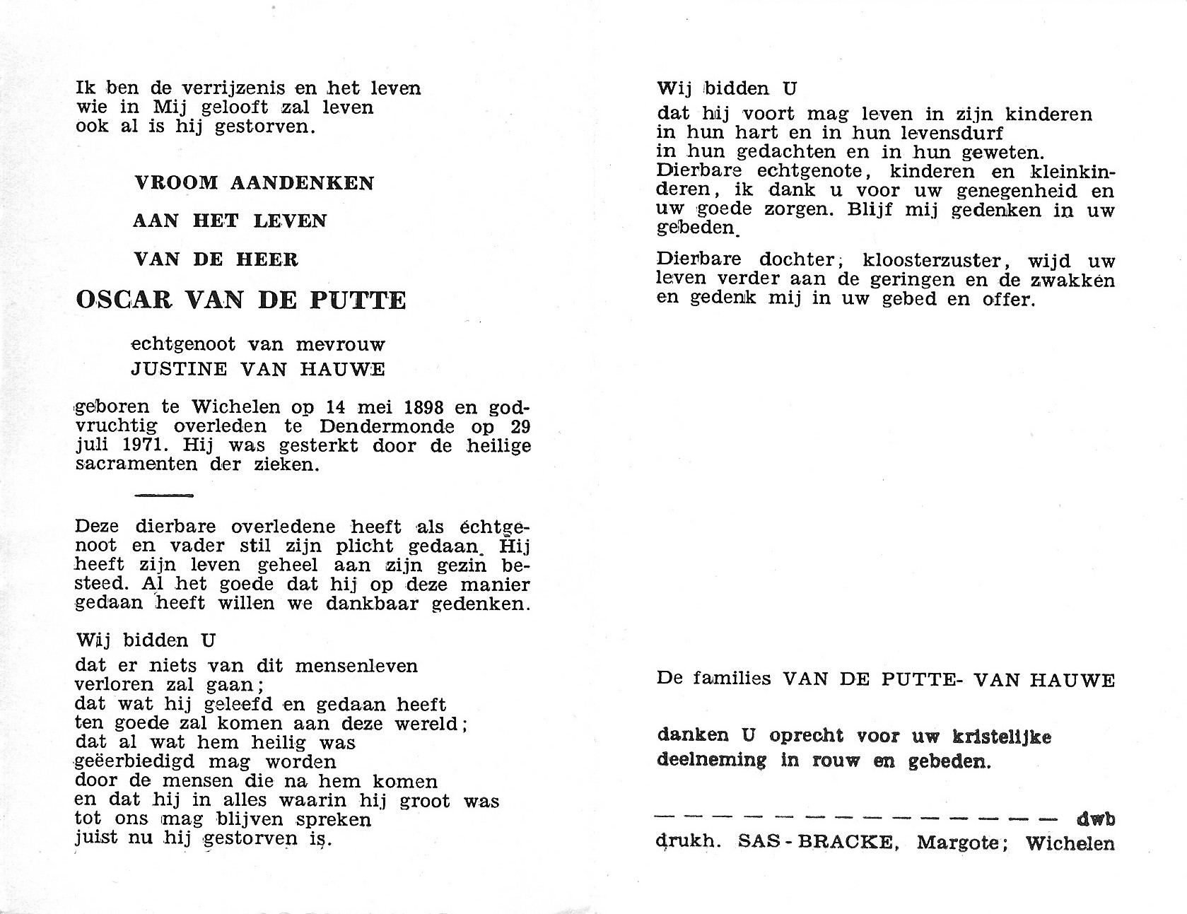 Overlijden van een broer | Oscar Van de Putte 29 juli 1971 (Leeftijd 80 jaar) |
