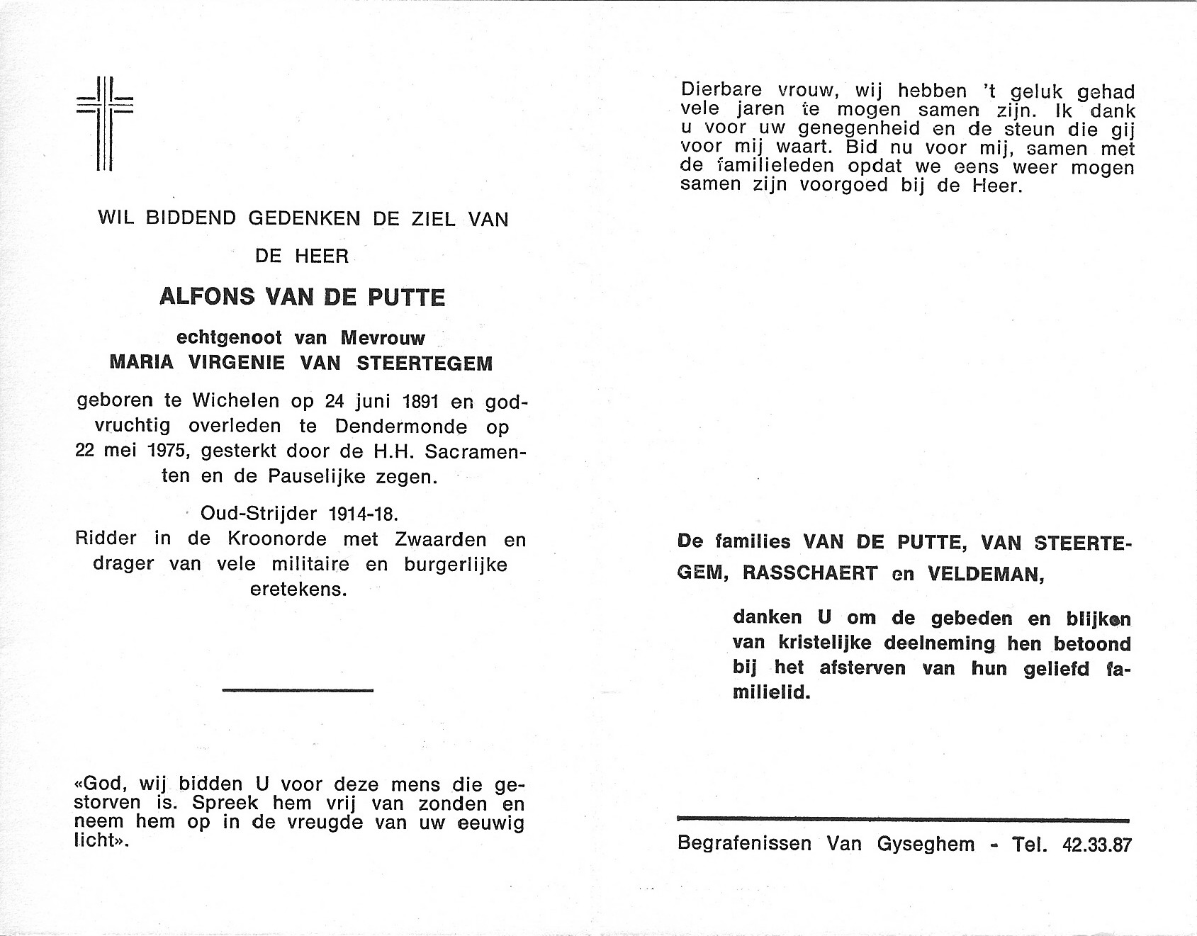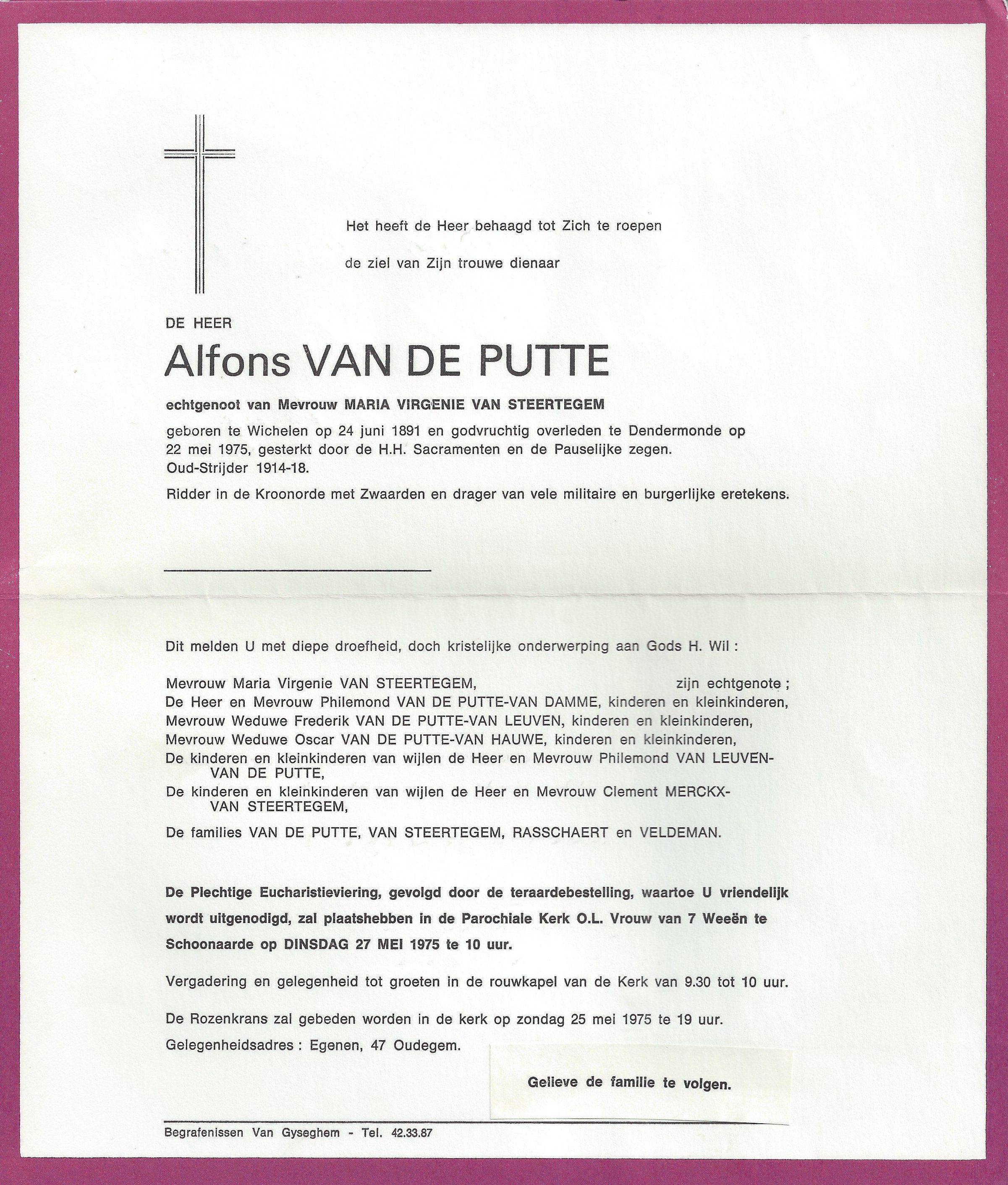 | Gedeelde notitie | Oudstrijder 1914-1918. Dooppeter van Alfons Van de Putte (zoon van zijn broer Philemon Van de Putte). Overleden op Eegene Schoonaarde. |