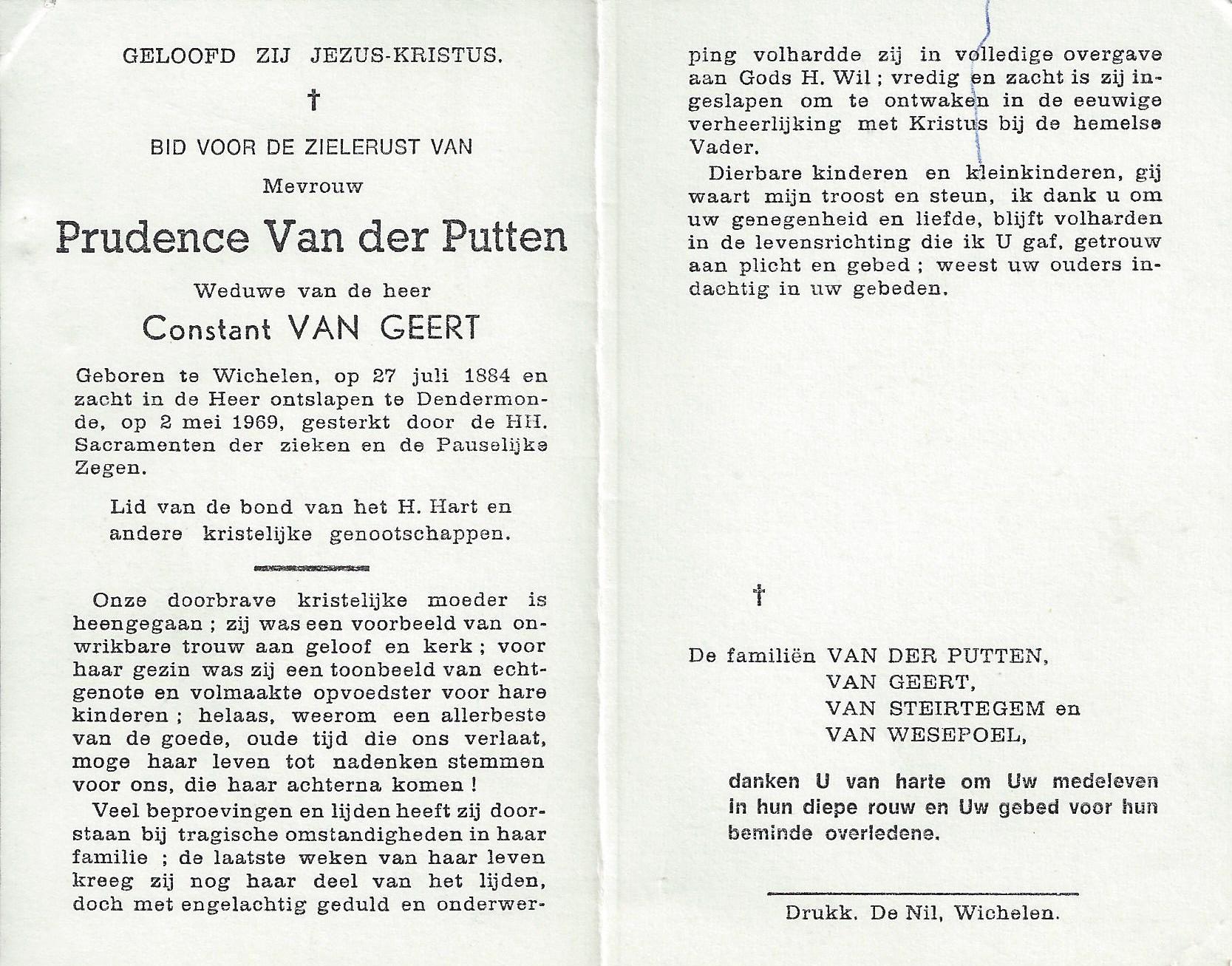 Overlijden van een zus | Prudentia Van der Putten 2 mei 1969 (Leeftijd 70 jaar) |