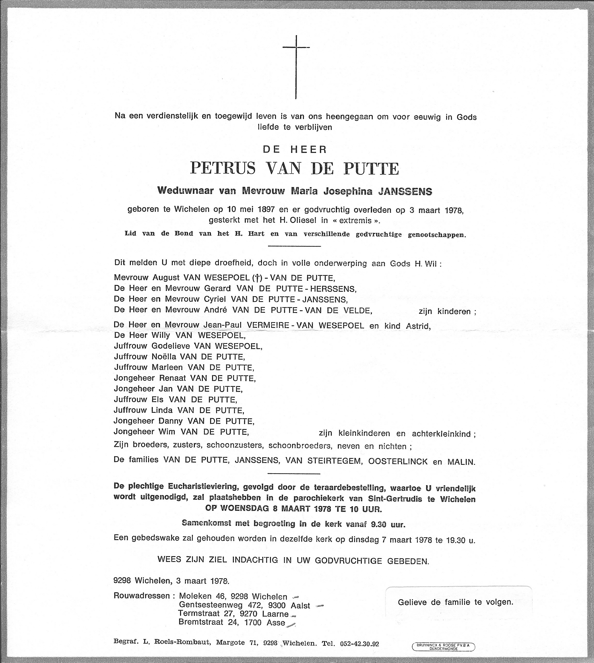 Begrafenis van een broer | Petrus Van de Putte 8 maart 1978 (Leeftijd 78 jaar) |