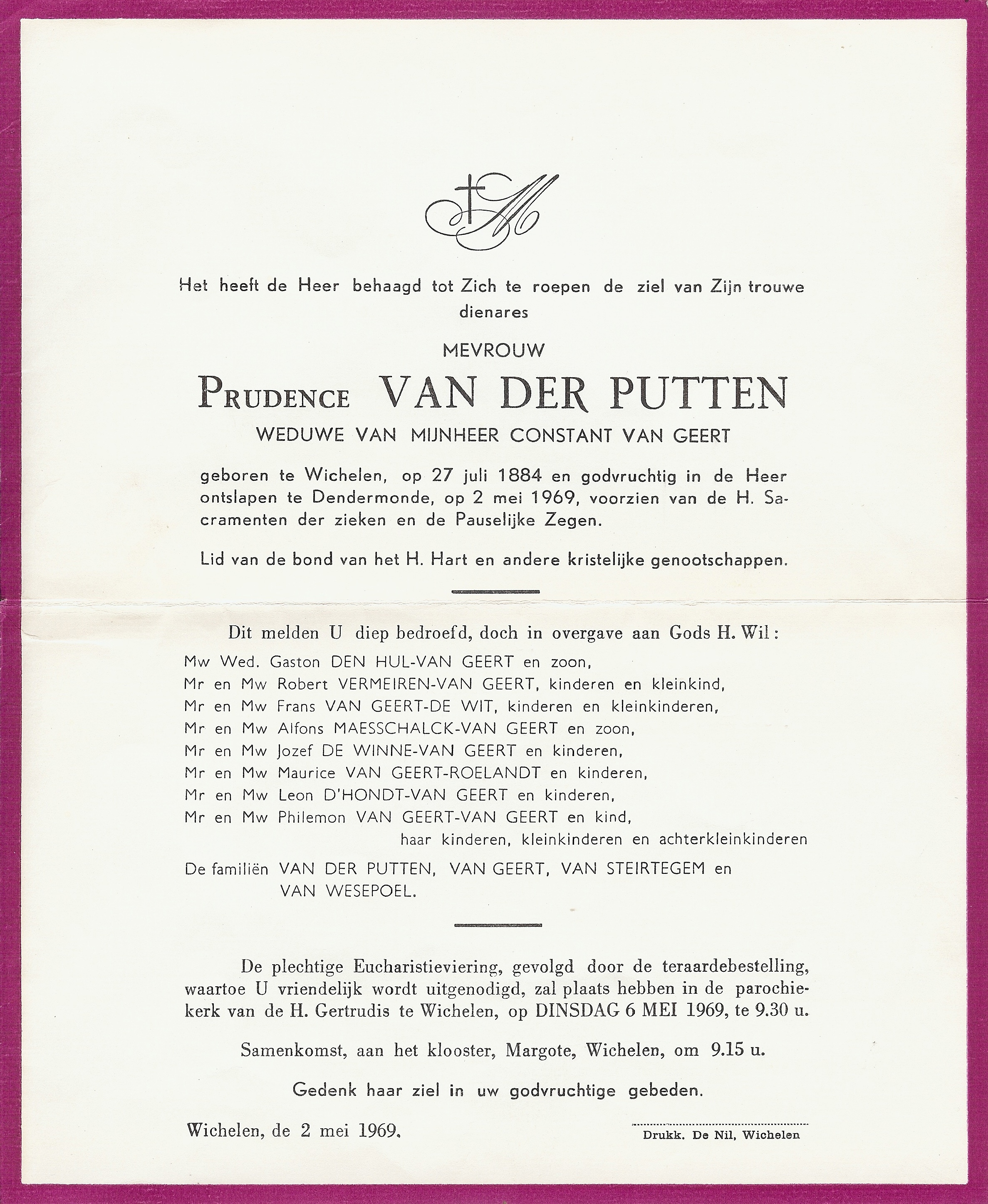 Begrafenis van een zus | Prudentia Van der Putten 6 mei 1969 (Leeftijd 70 jaar) |