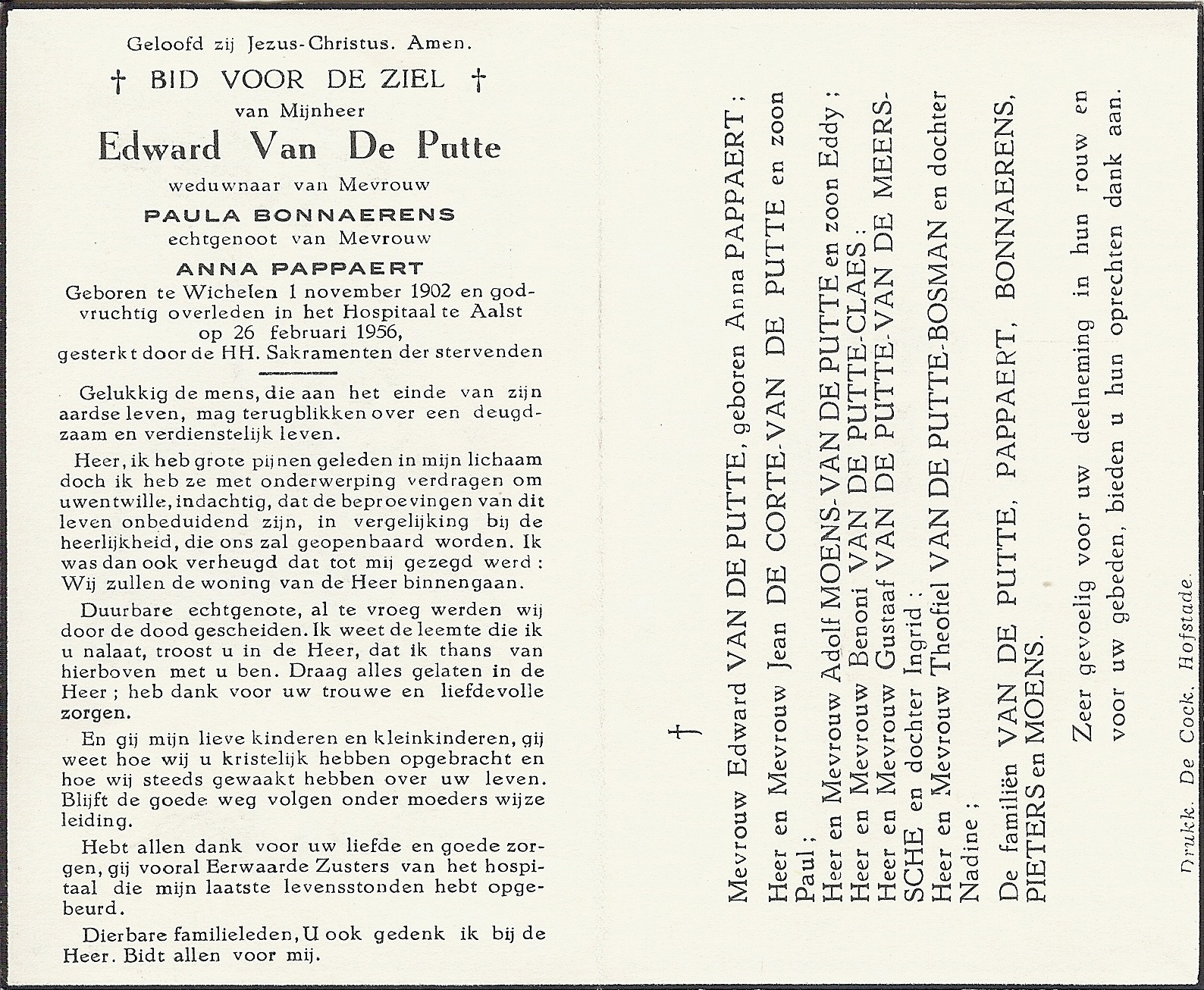 Overlijden van een broer | Eduardus Van de Putte 26 februari 1956 (Leeftijd 54 jaar) |