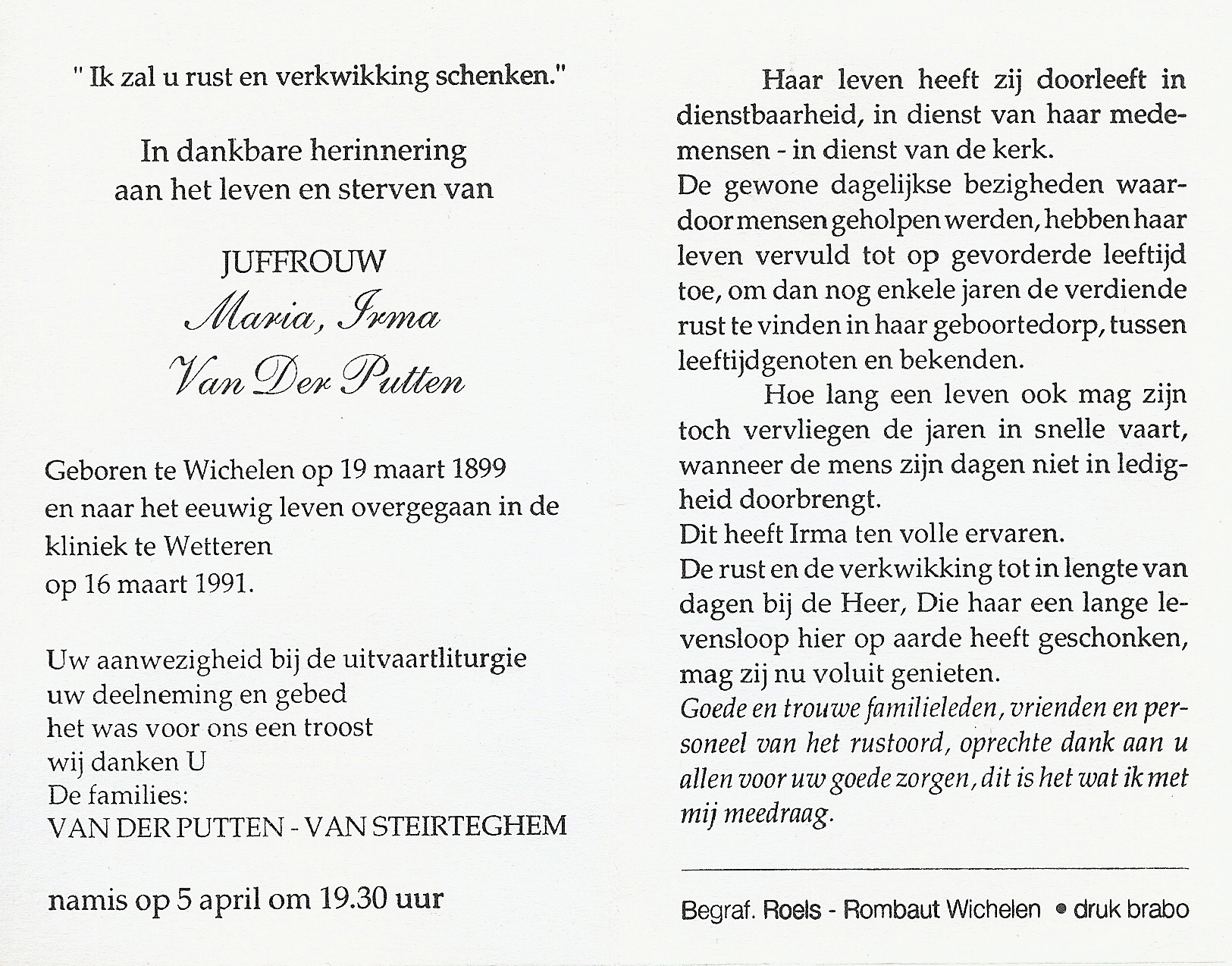 Overlijden van een zus | Maria Irma Van der Putten 16 maart 1991 (Leeftijd 82 jaar) |