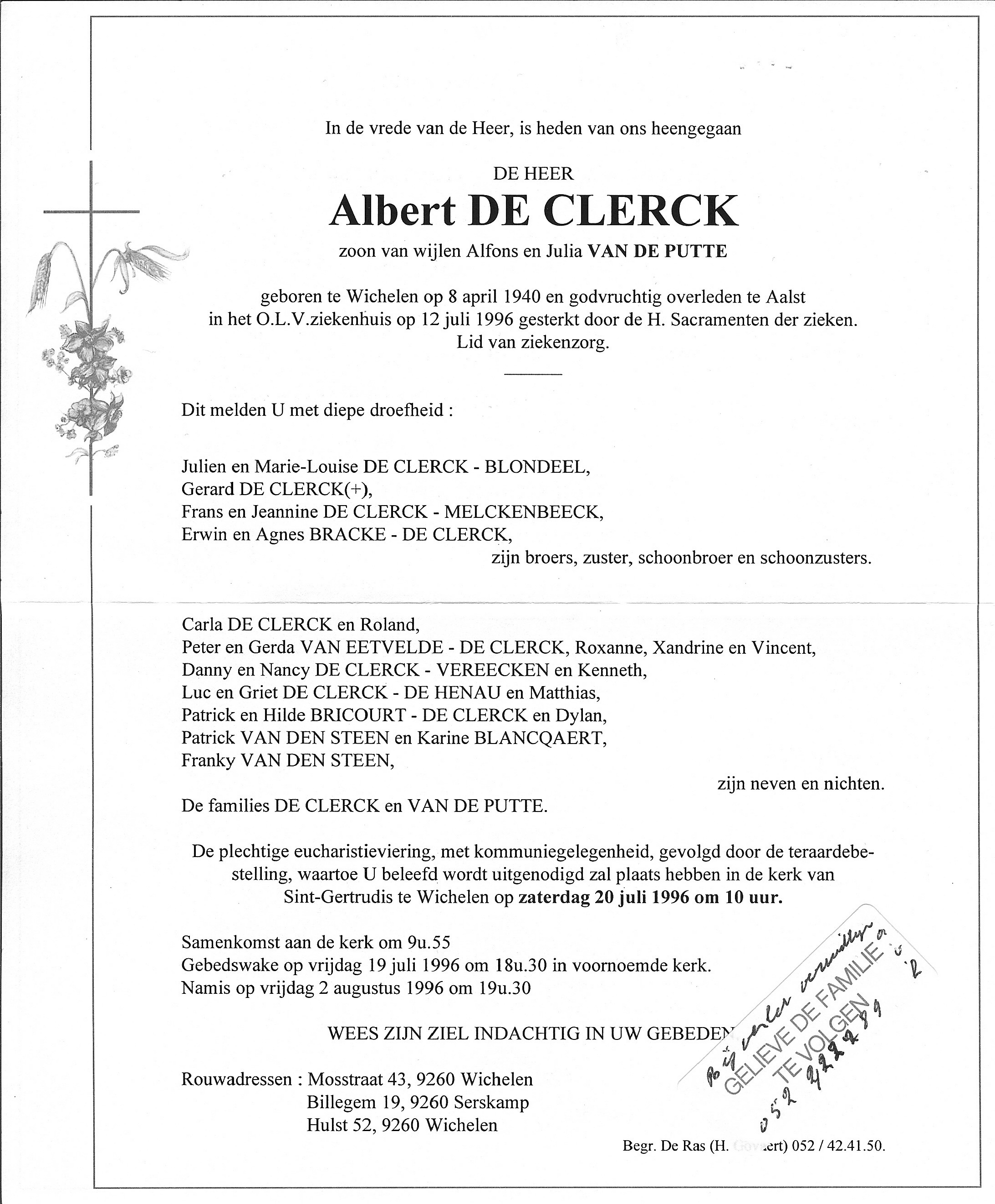 Begrafenis van een broer | Albert De Clerck 20 juli 1996 (Leeftijd 59 jaar) |
