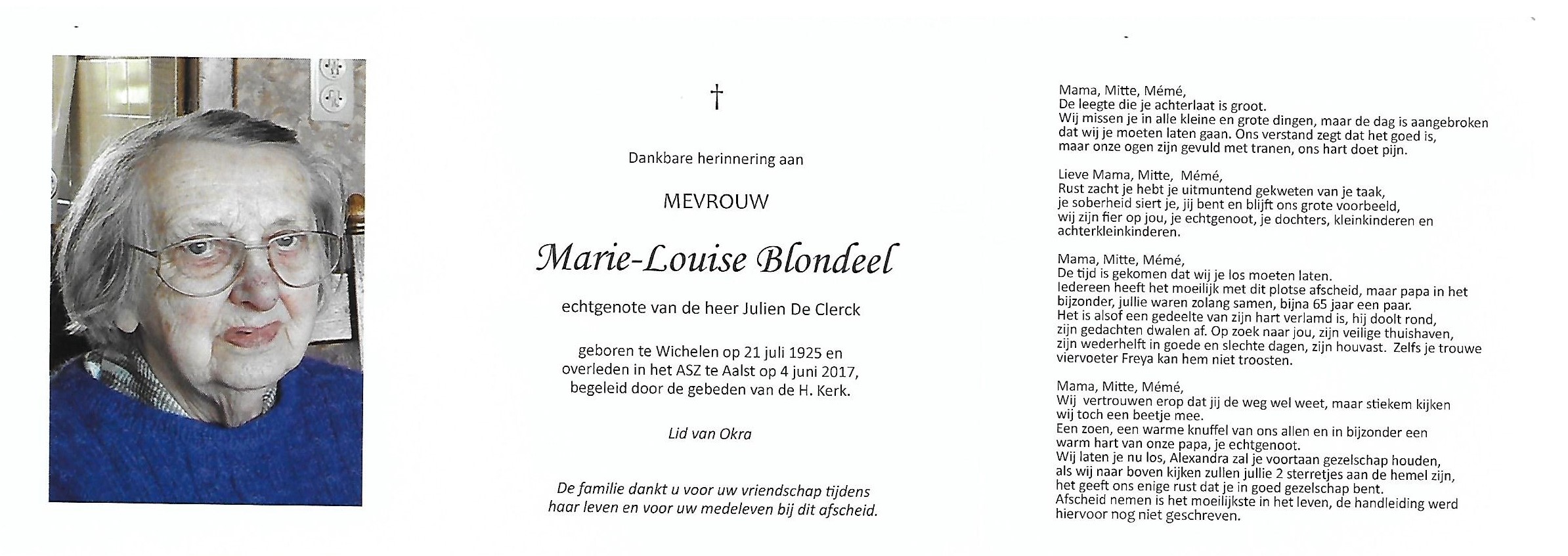 Maria Louisa Victorina Blondeel Geboren: 21 juli 1925 — Wichelen Overleden: 4 juni 2017 — Aalst |