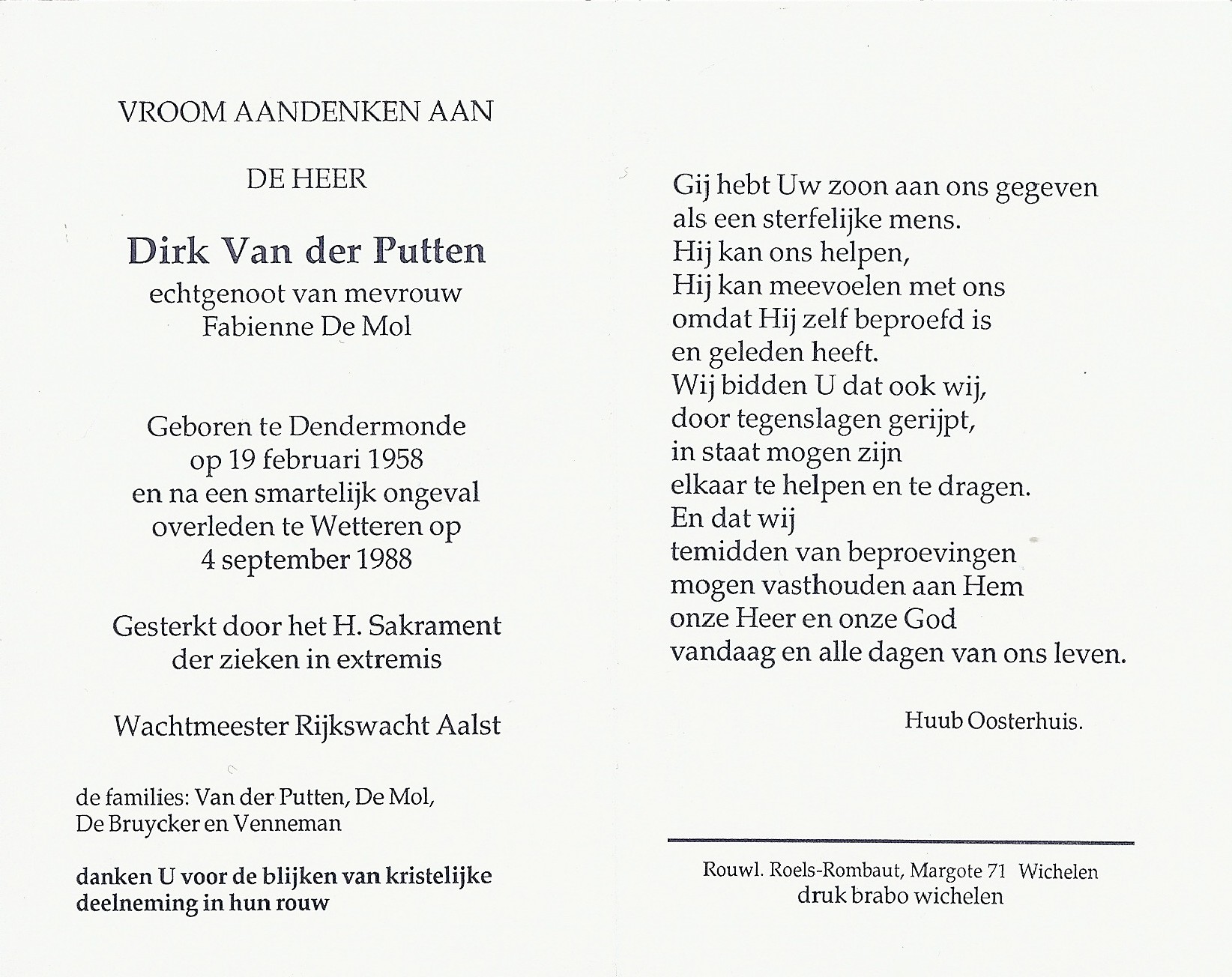 Overlijden van een zoon | Dirk Frans Marie Van der Putten 4 september 1988 (Leeftijd 59 jaar) |