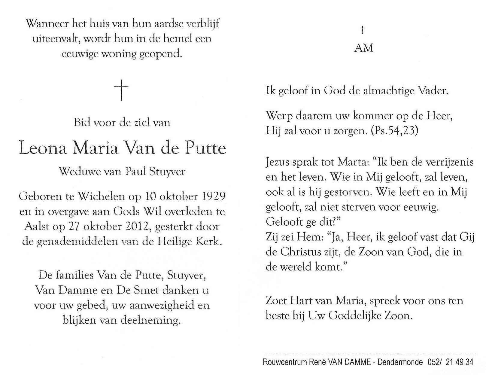 Leona Maria Van de Putte Geboren: 10 oktober 1929 36 27 — Wichelen Overleden: 27 oktober 2012 — Aalst |