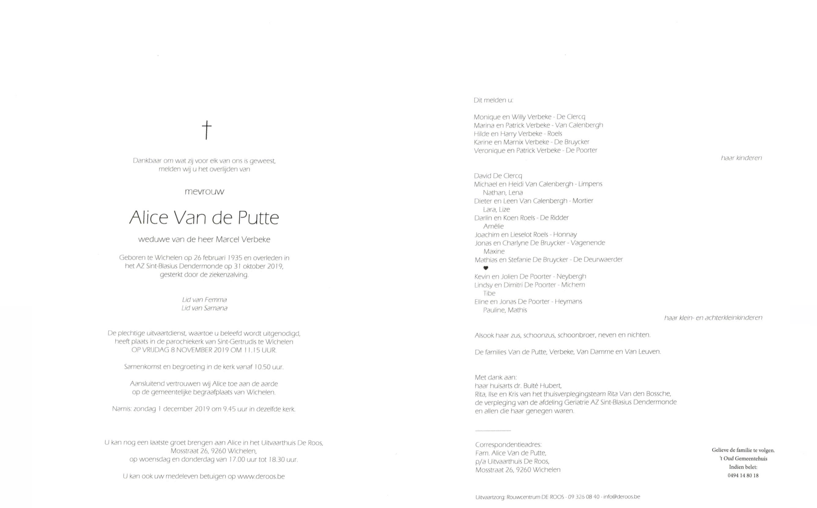 Alice Godelieve Van de PutteLeeftijd: 84 jaar1935–2019