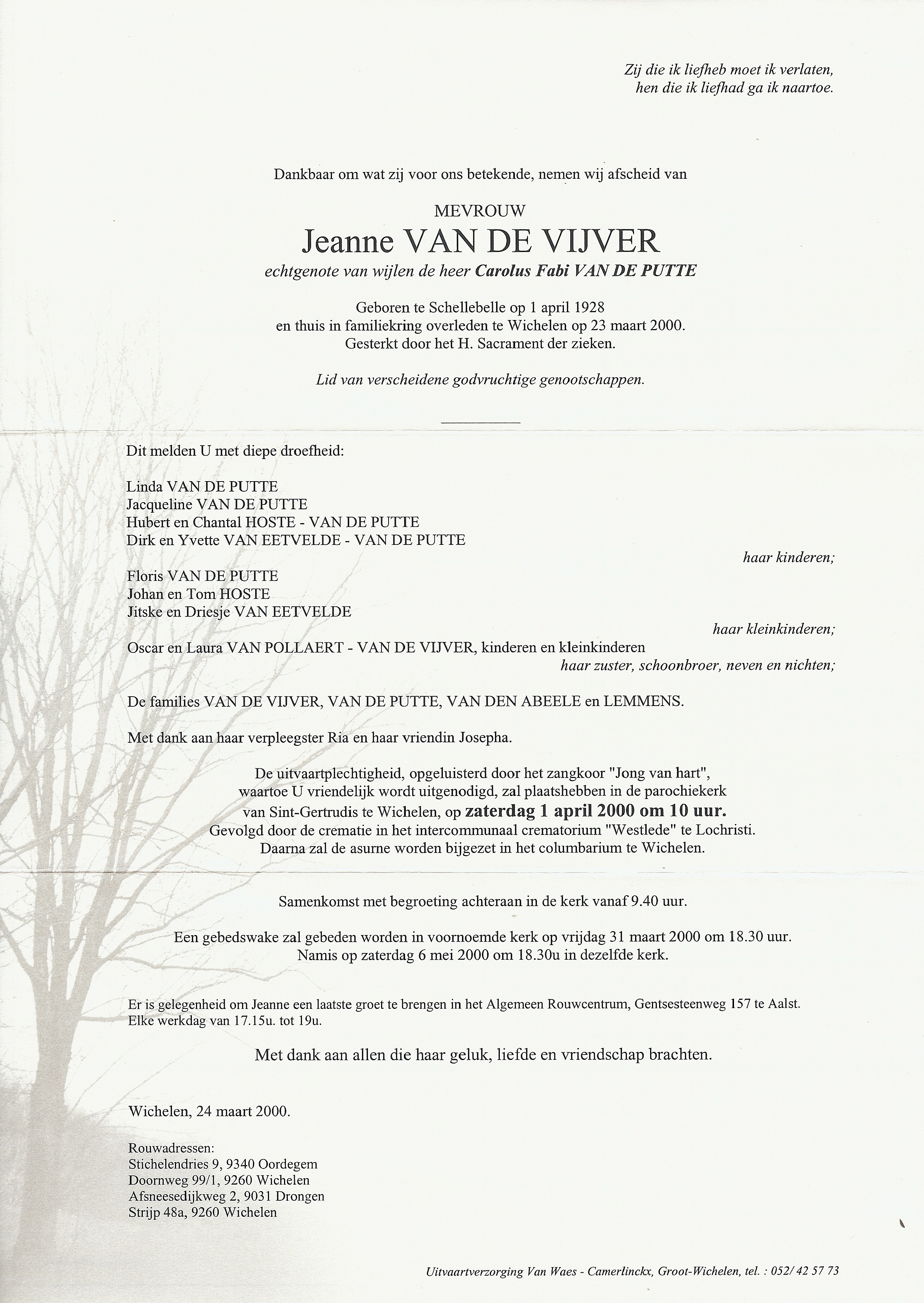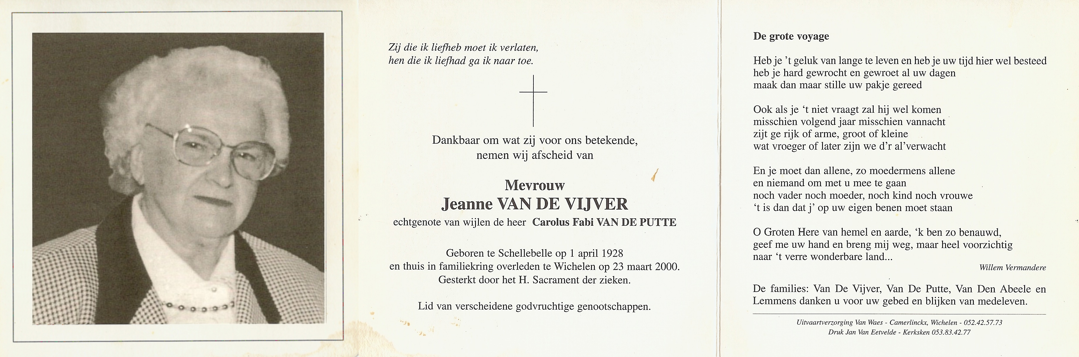 Overlijden van een echtgenoot | Carolus Fabianus Van de Putte 2 augustus 1999 (Leeftijd 71 jaar) |