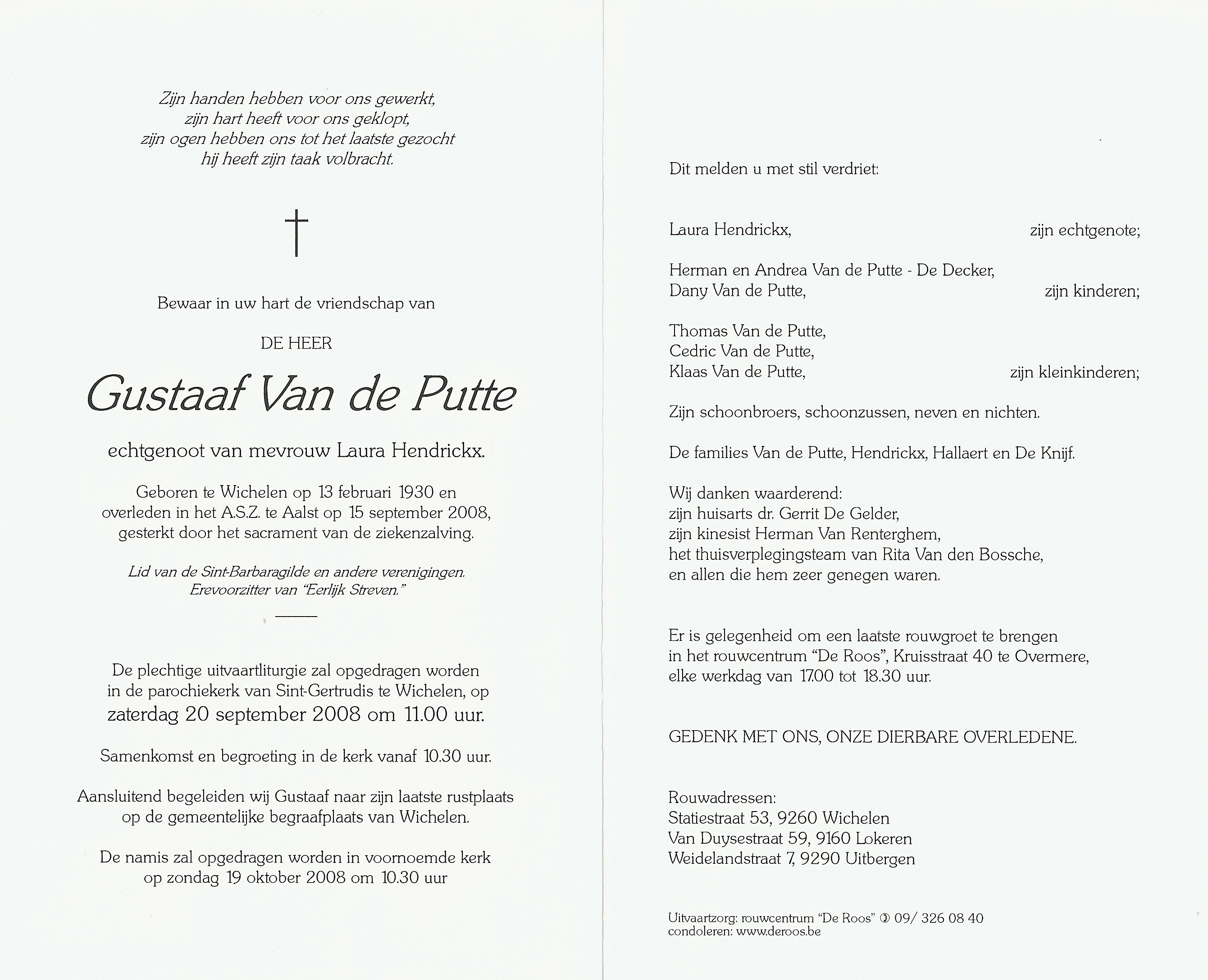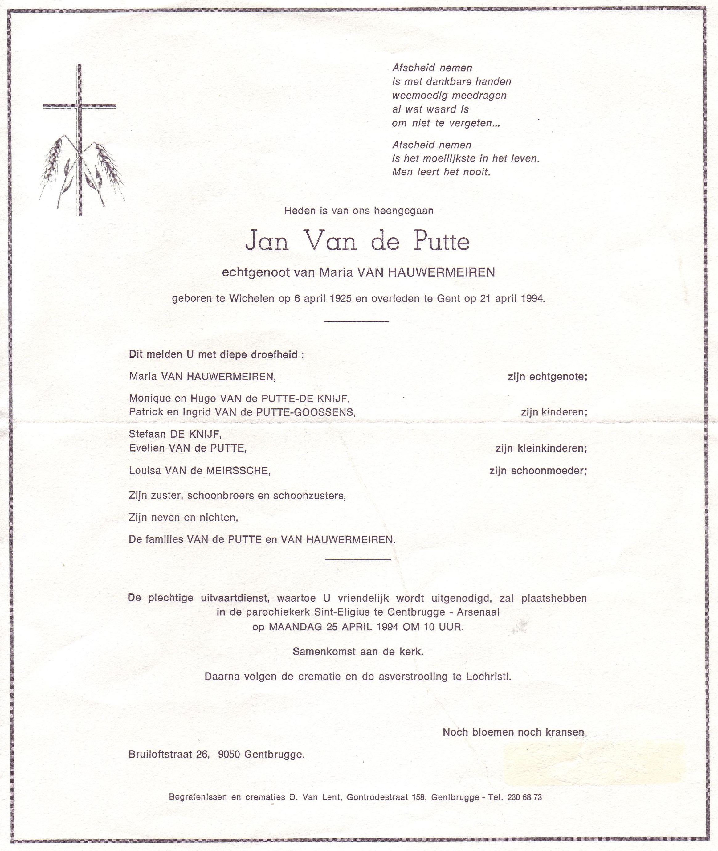 Overlijden van een broer | Jan Kamiel Van de Putte 21 april 1994 (Leeftijd 64 jaar) |