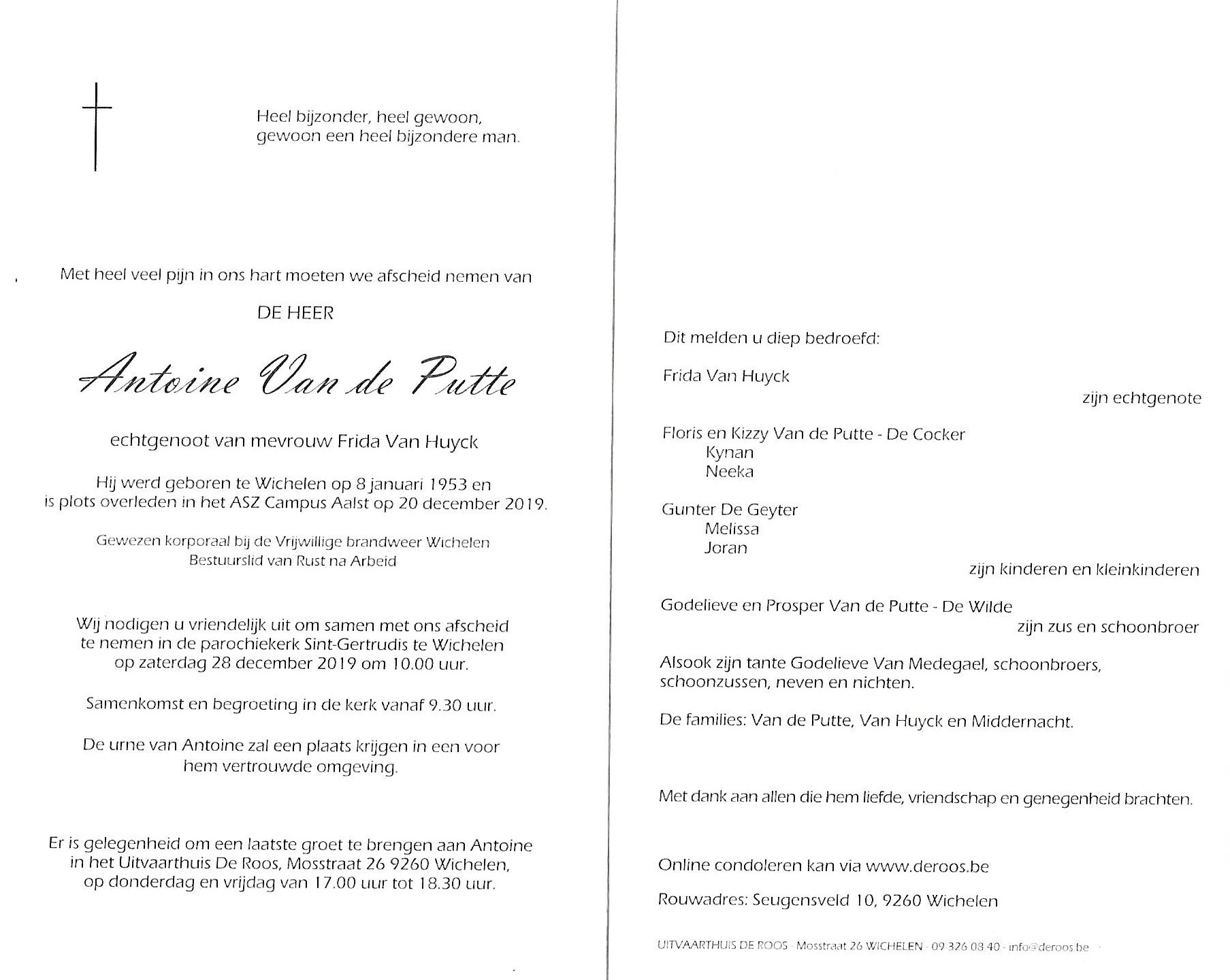 Geboren: 8 januari 1953 47 29 — Wichelen Overleden: 20 december 2019 — Aalst |