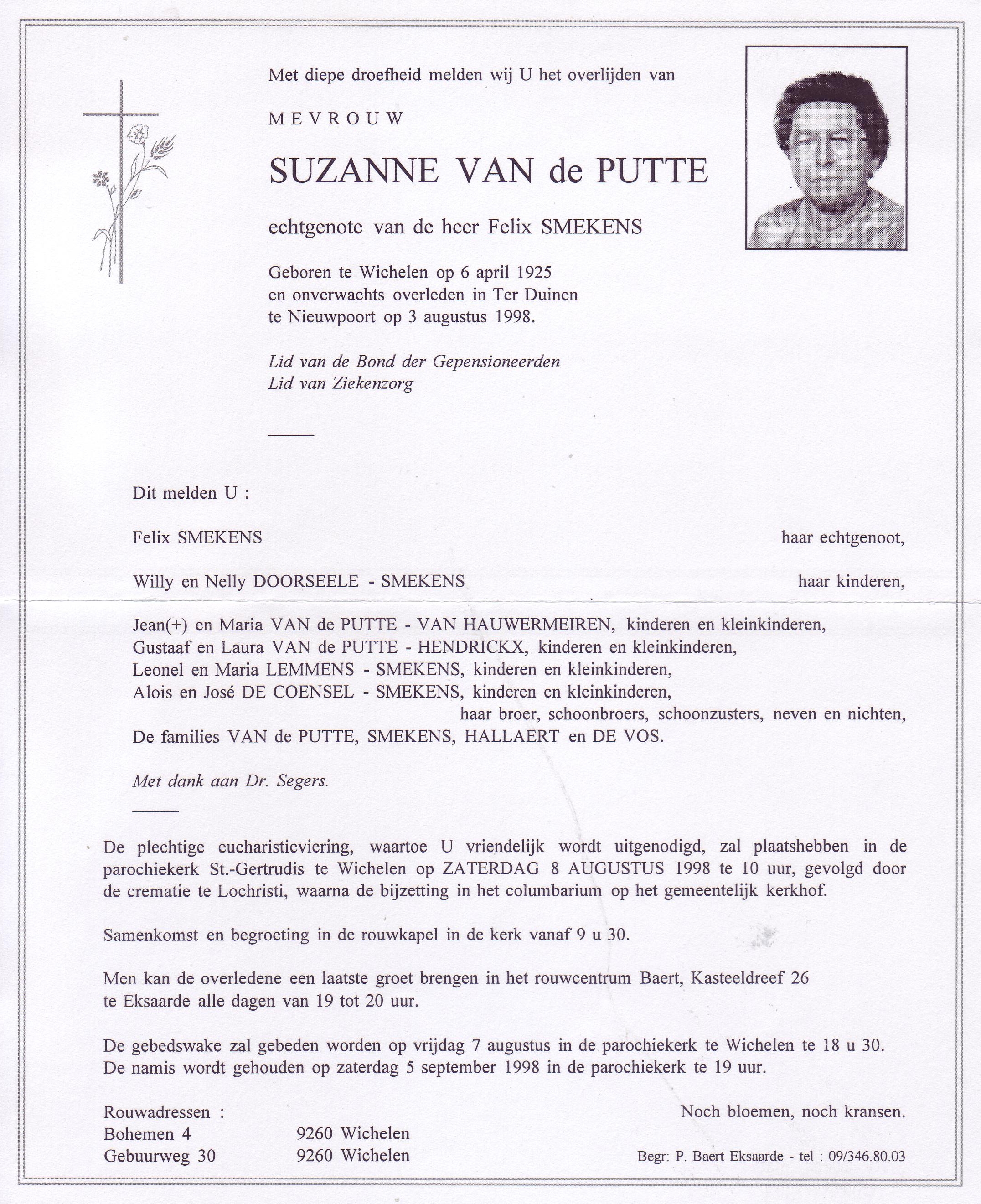Begrafenis van een echtgenote | Susanne Dominica Van de Putte 8 augustus 1998 (Leeftijd 75 jaar) |