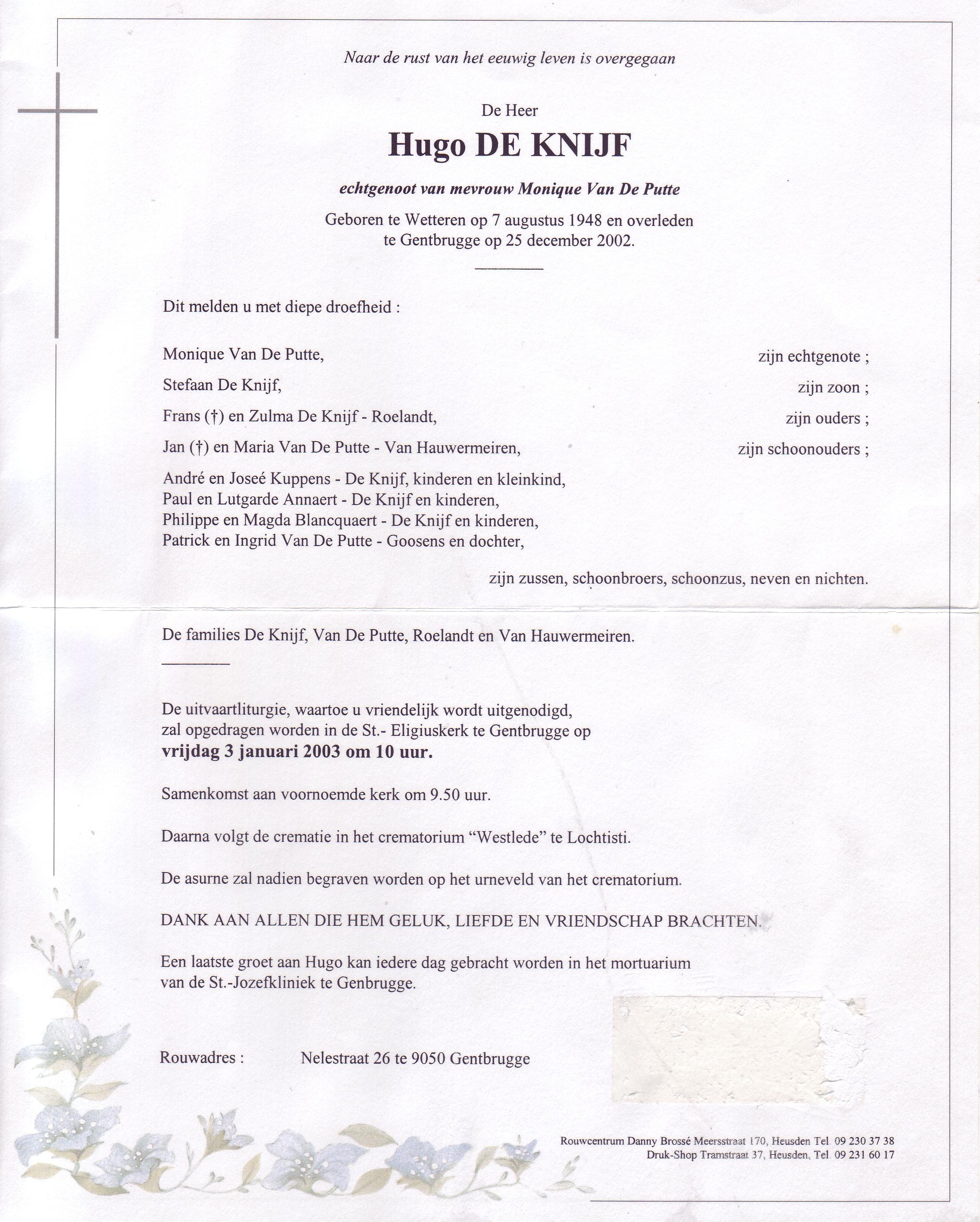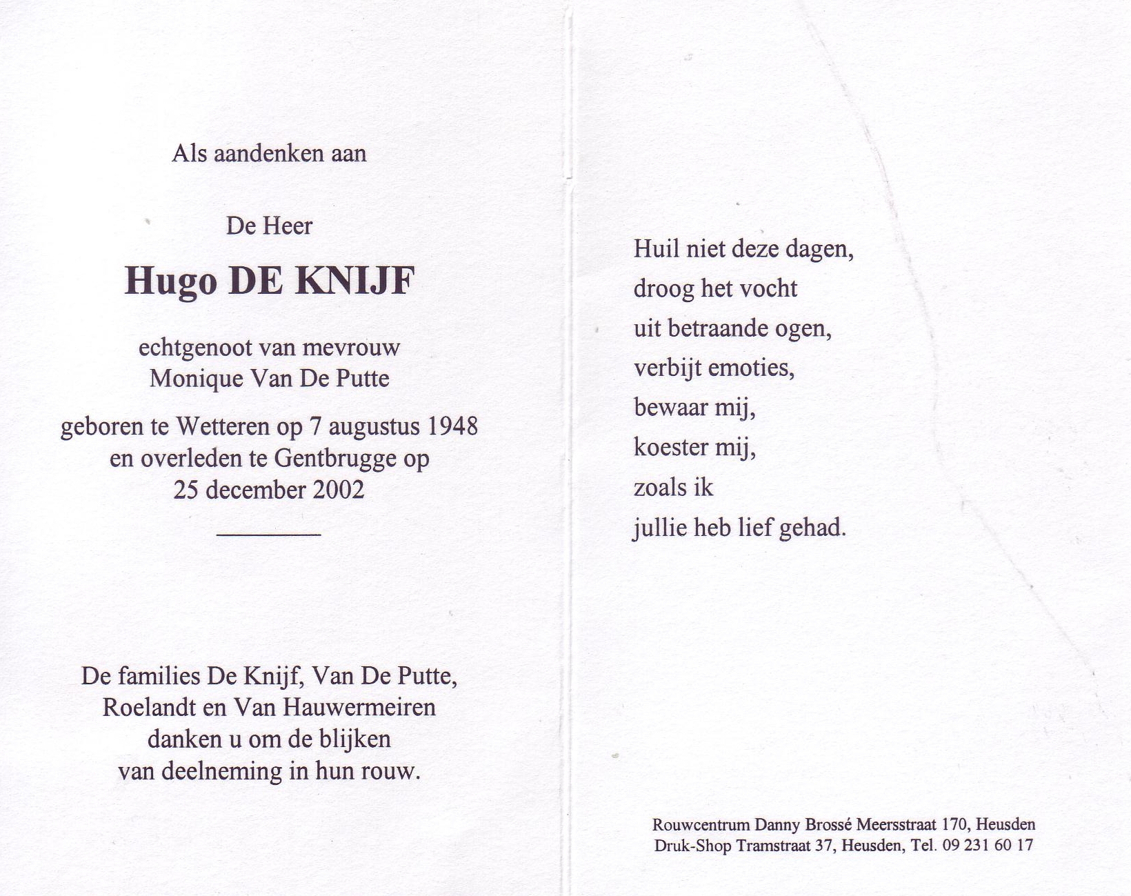 Hugo De Knijf Geboren: 7 augustus 1948 — Wetteren Overleden: 25 december 2002 — Gentbrugge |