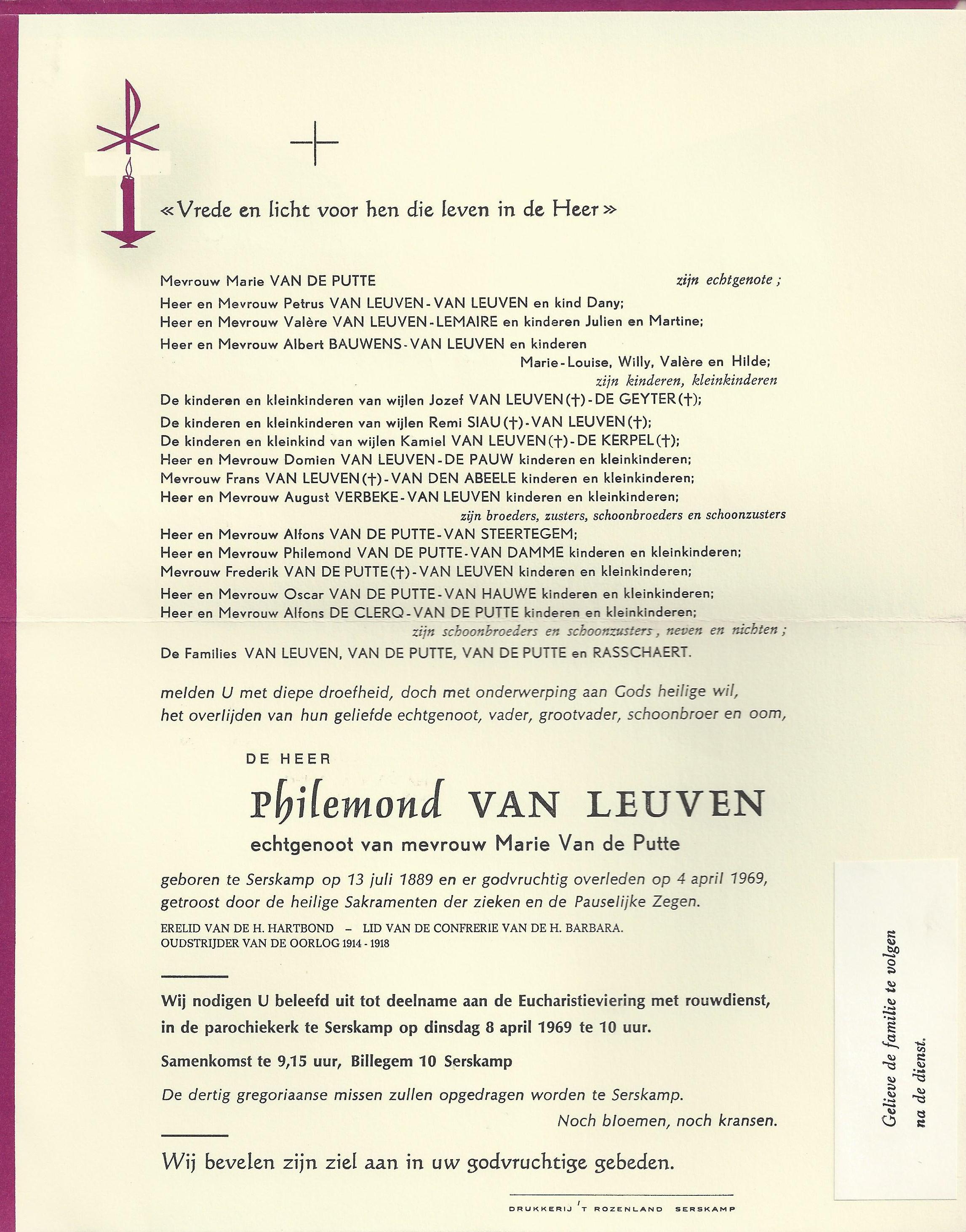Begrafenis van een broer | Philemond Van Leuven 8 april 1969 (Leeftijd 68 jaar) |