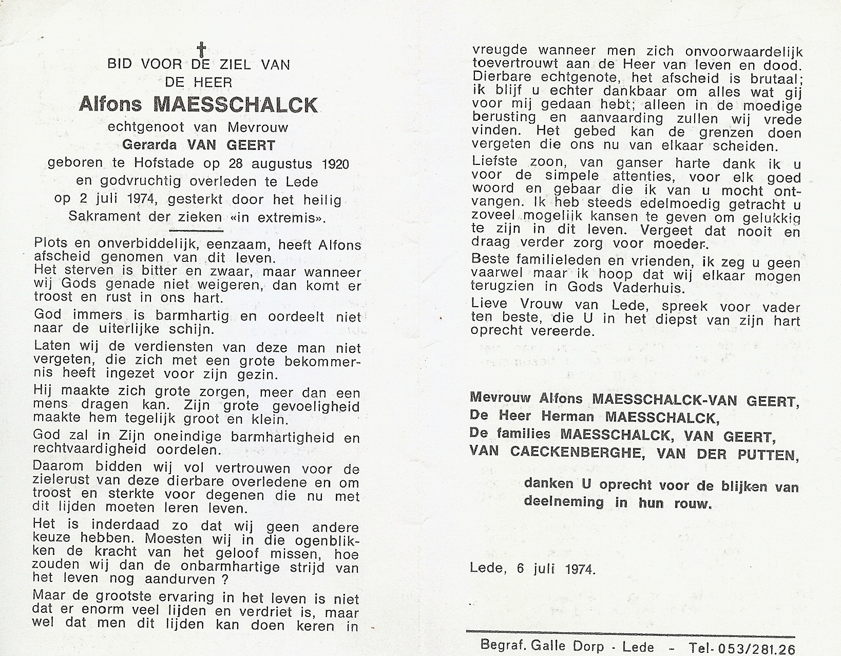 Alfons Maesschalck Geboren: 28 augustus 1920 — Hofstade Overleden: 2 juli 1974 — Lede |