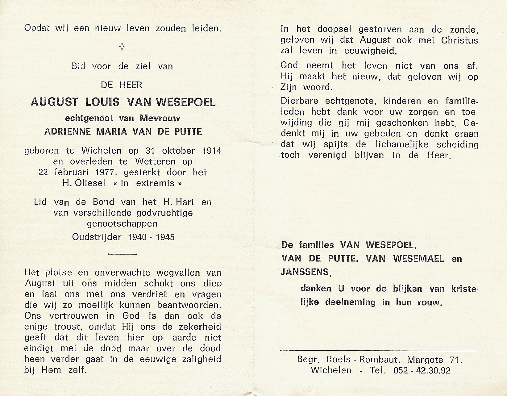 Overlijden van een echtgenoot | Augustus Louis Van Wesepoel 22 februari 1977 (Leeftijd 50 jaar) |