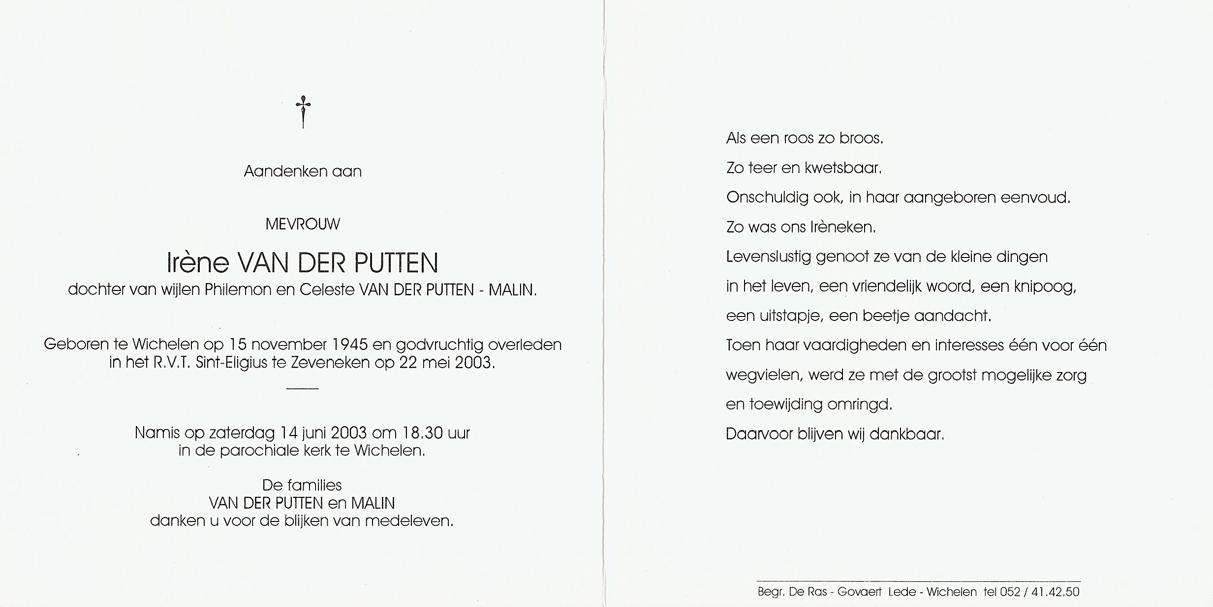 Irene Prudence Van der Putten Geboren: 15 november 1945 44 36 — Wichelen Overleden: 22 mei 2003 — Zeveneken |