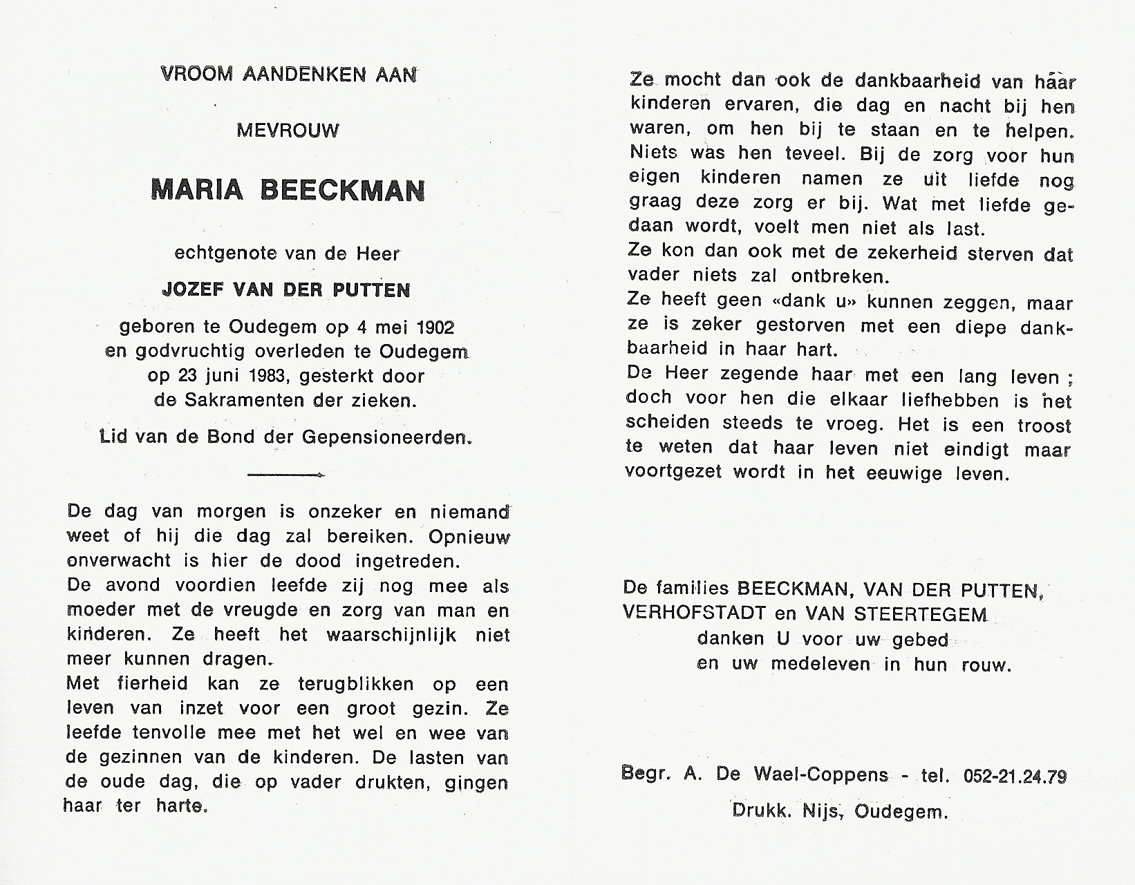 Geboren: 2 november 1902 41 39 — Wichelen Overleden: 30 mei 1985 — Dendermonde |