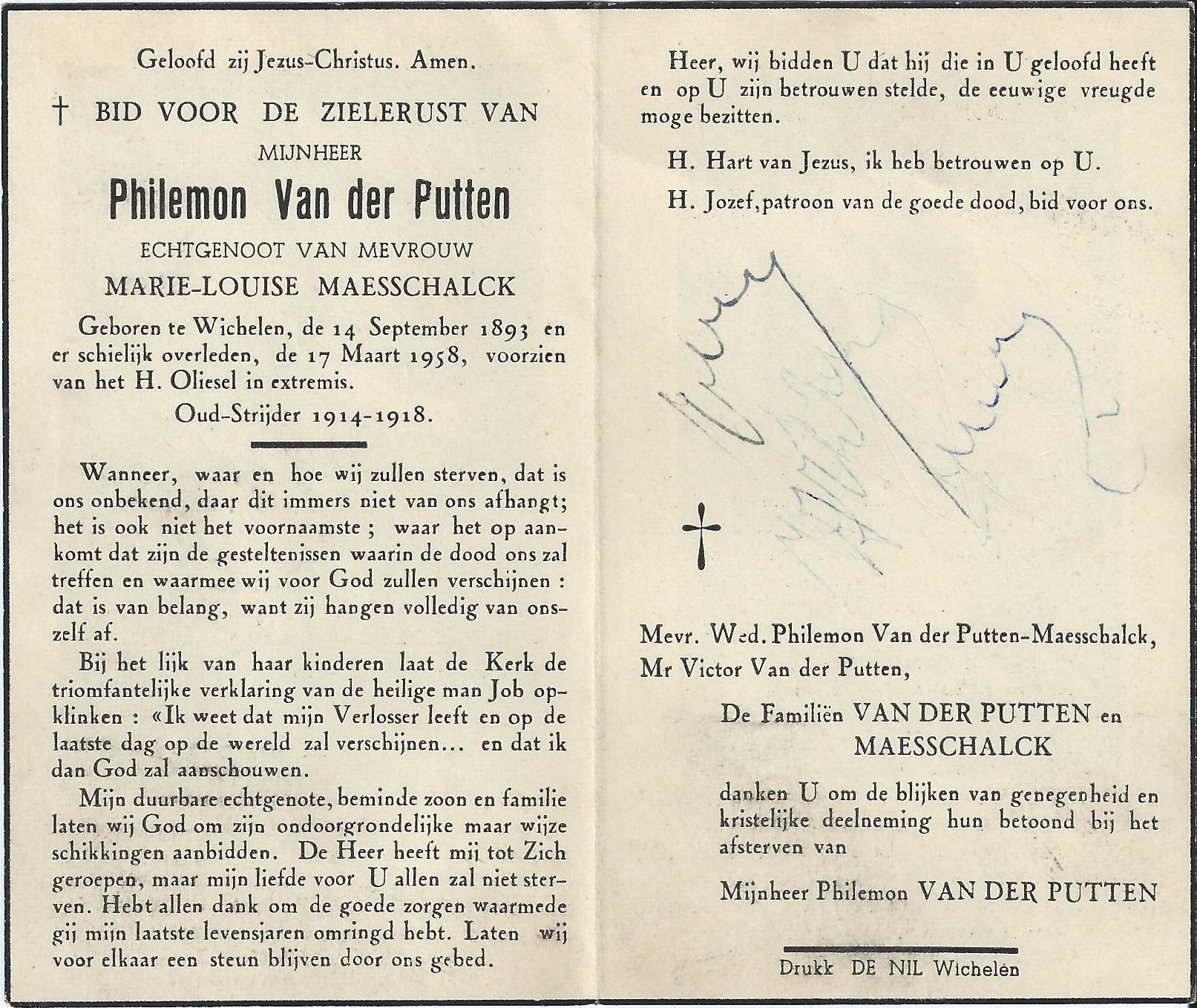 Overlijden van een zoon | Frans Joseph Van der Putten 4 januari 1922 (Leeftijd 28 jaar) |