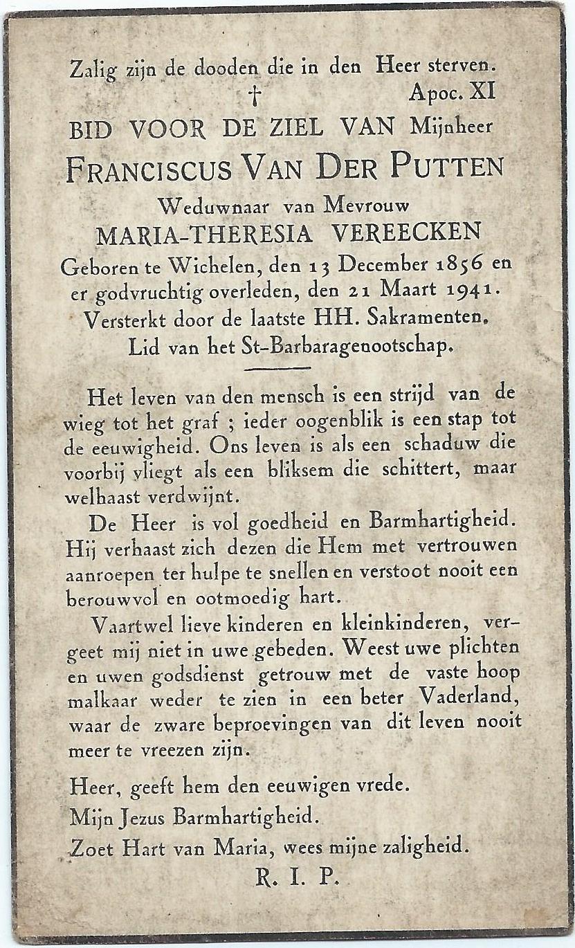 Petrus Franciscus Van der Putten Geboren: 13 december 1856 41 39 — Wichelen Overleden: 21 maart 1941 — Wichelen |
