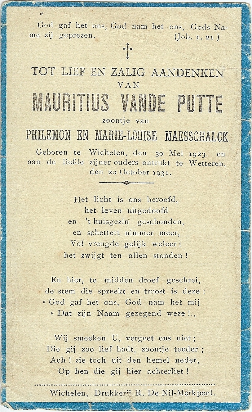 Mauritius Van der Putten Geboren: 30 mei 1923 29 30 — Wichelen Overleden: 20 oktober 1931 — Wetteren |