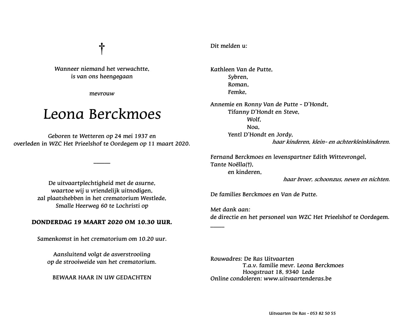 Leona Berckmoes Geboren: 24 mei 1937 — Wetteren Overleden: 11 maart 2020 — Oordegem |