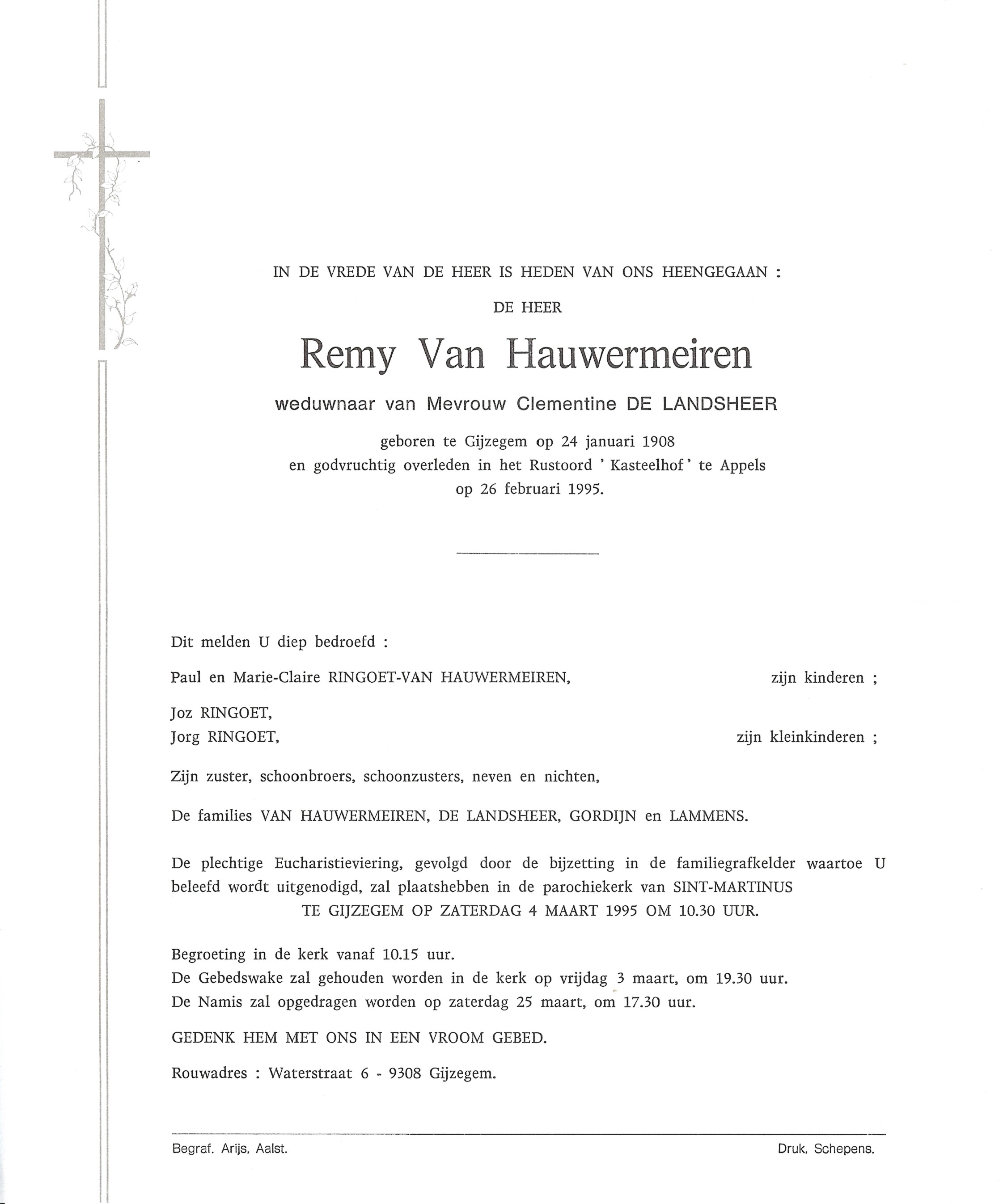 Remy Van Hauwermeiren Geboren: 24 februari 1908 32 31 — Gijzegem Overleden: 26 februari 1995 — Appels |