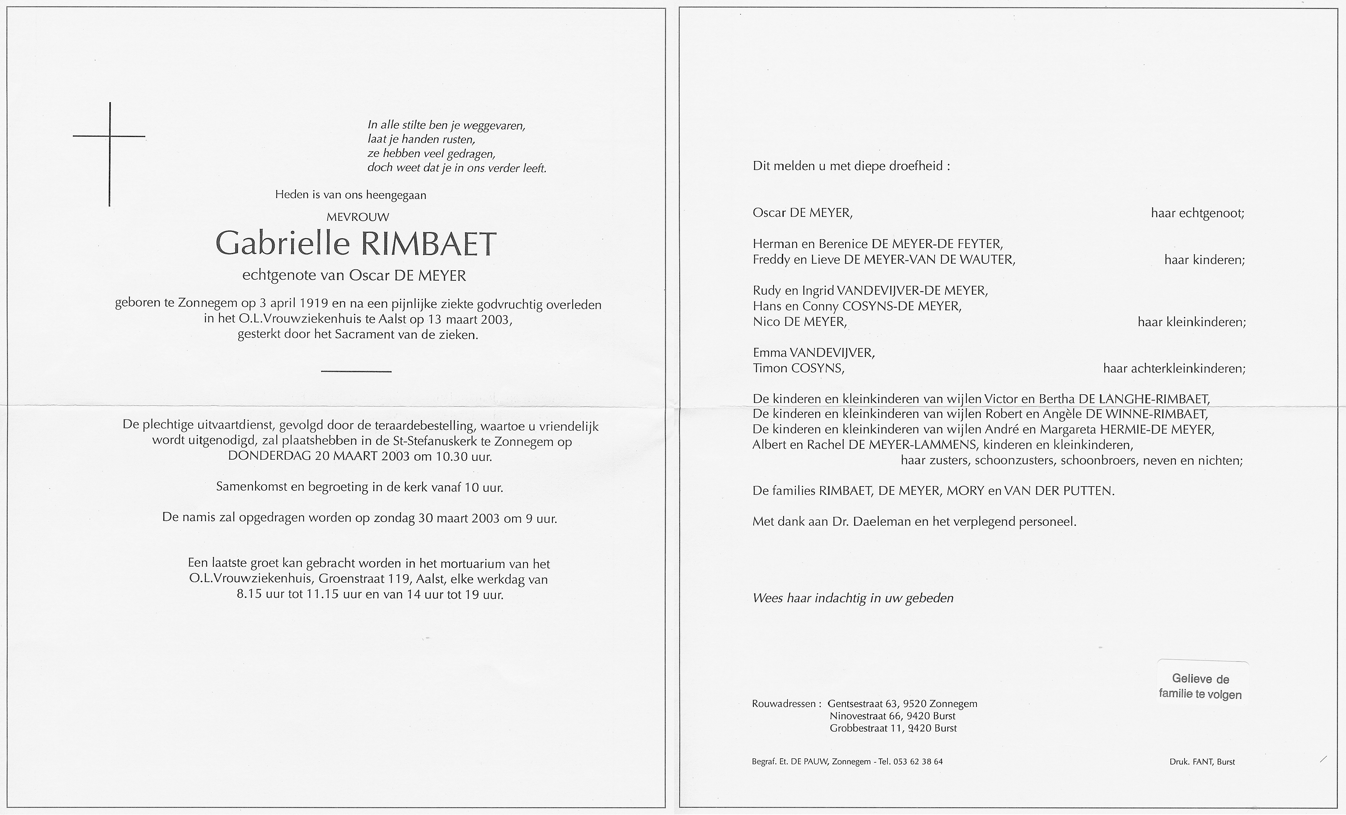 Begrafenis van een echtgenote | Gabrielle Rimbaet 20 maart 2003 (Leeftijd 85 jaar) |