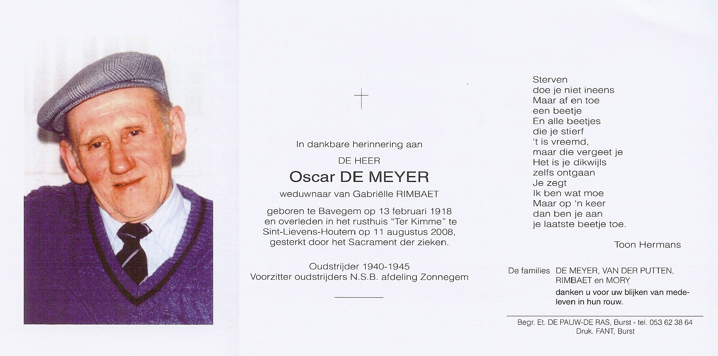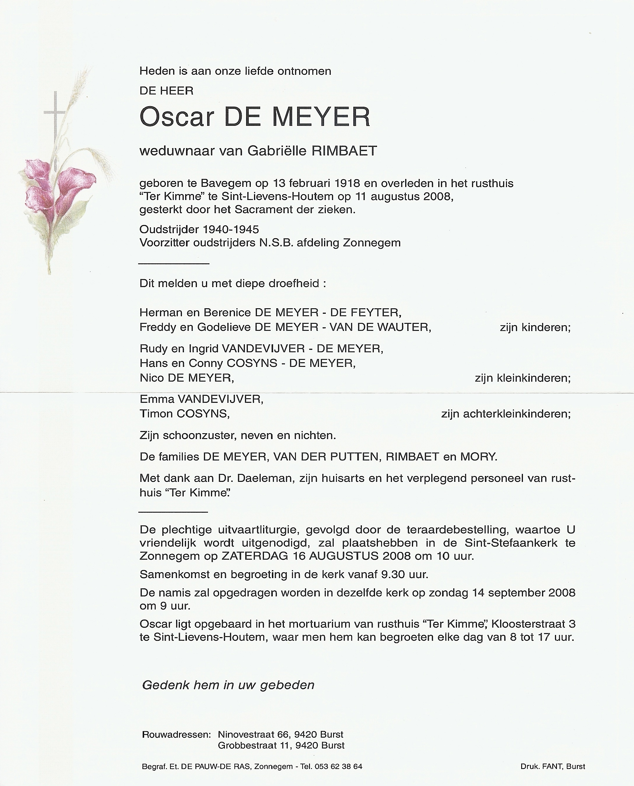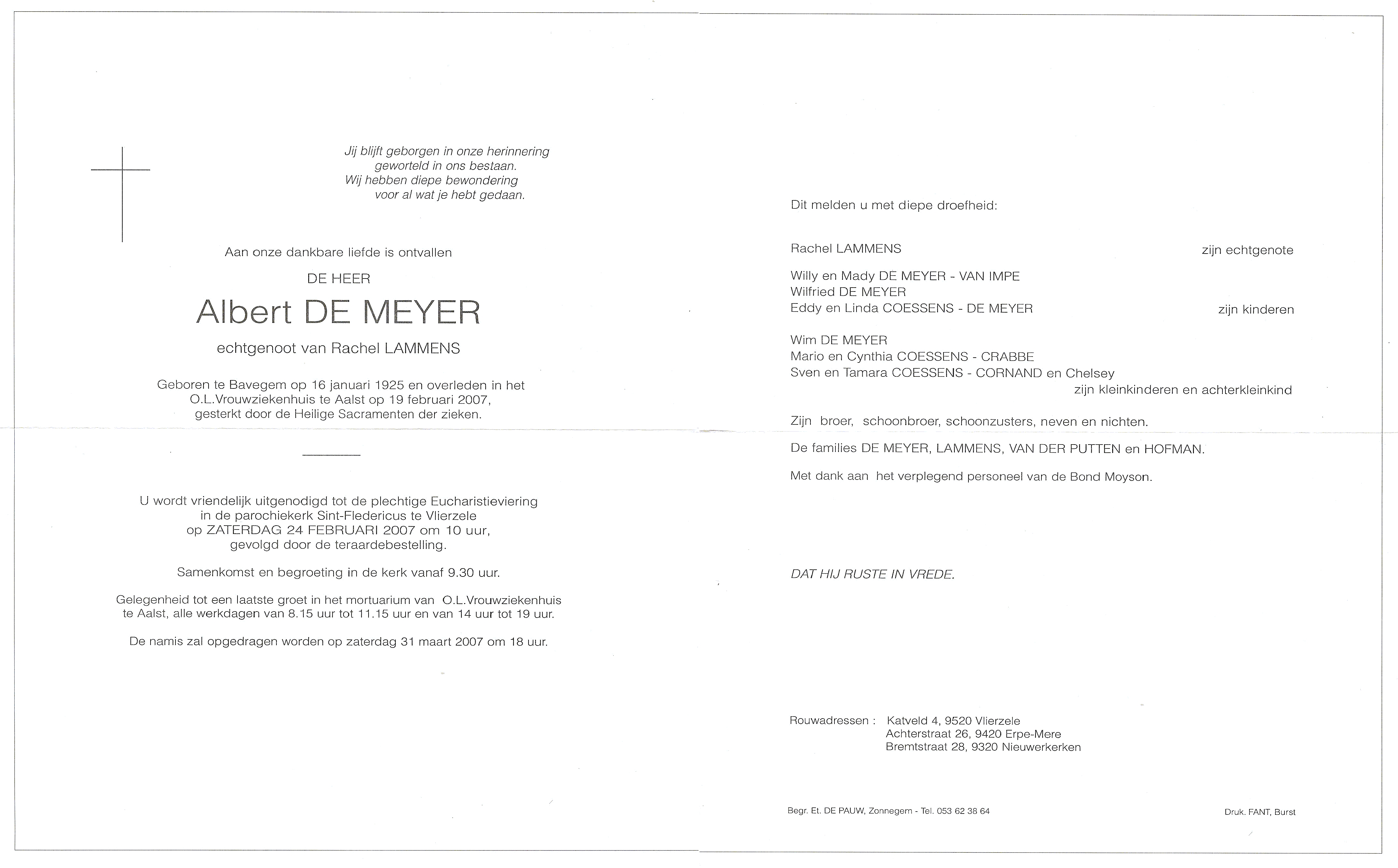 Begrafenis van een broer | Albert Florent De Meyer 24 februari 2007 (Leeftijd 89 jaar) |