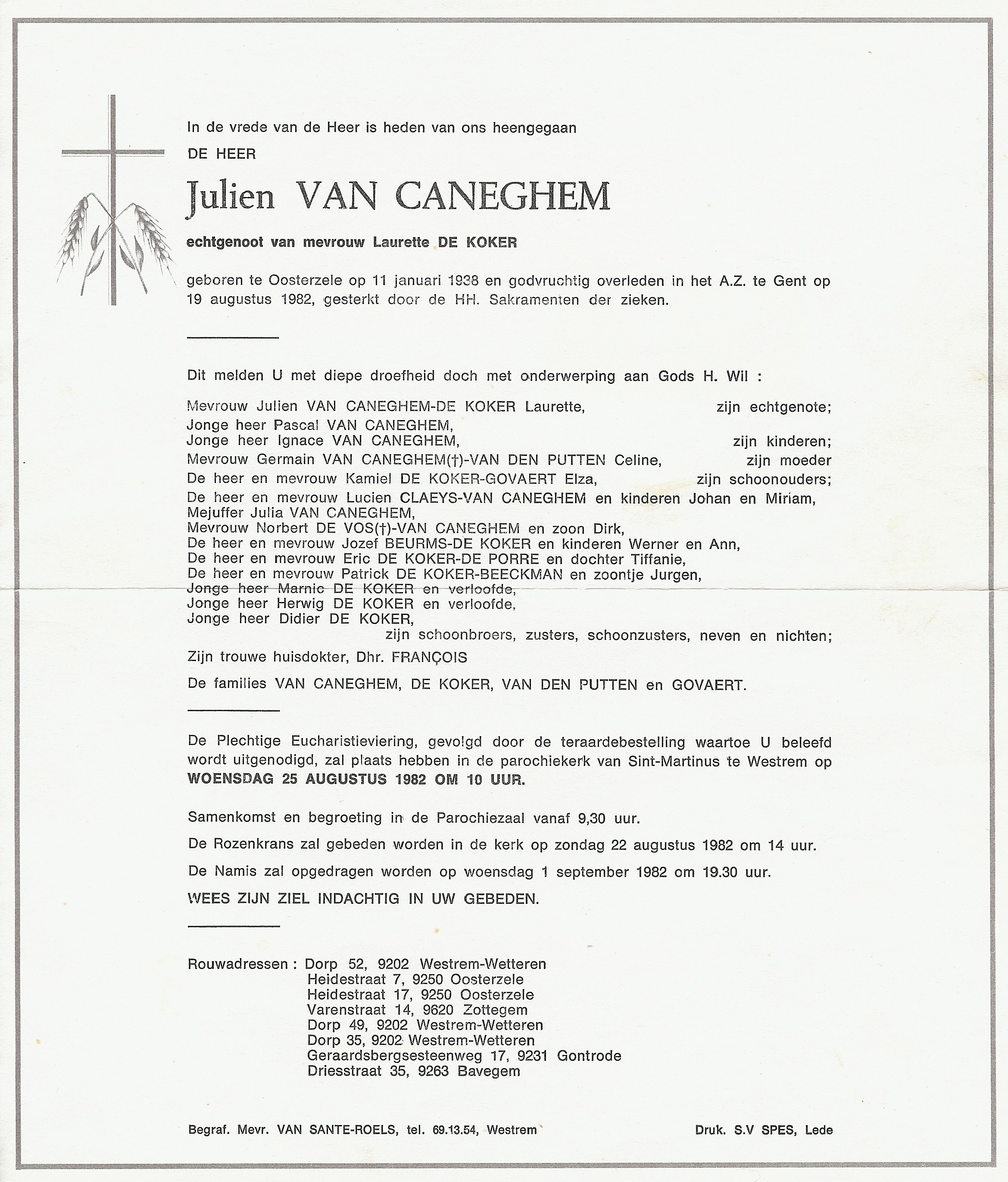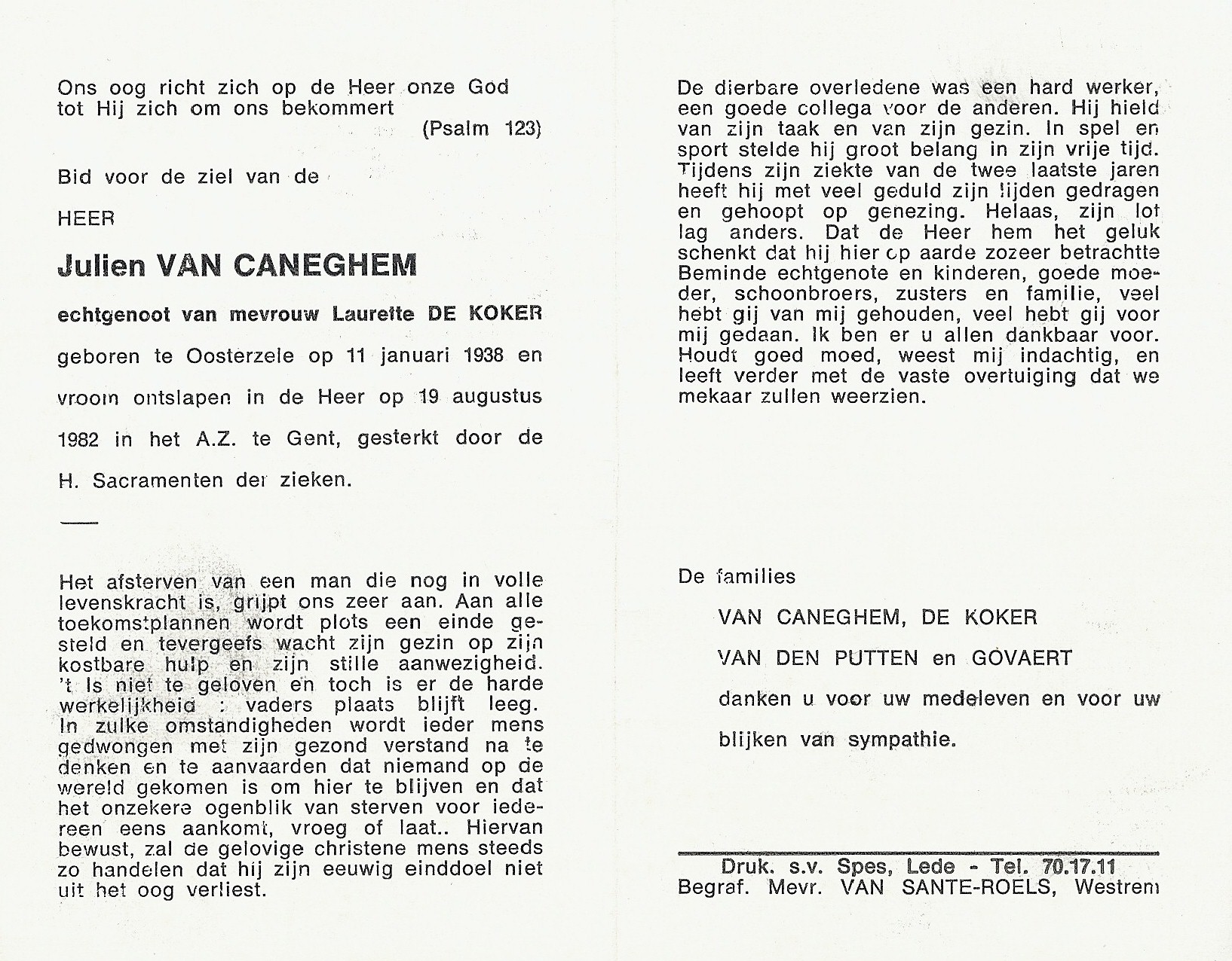 Julien Van Caneghem Geboren: 11 januari 1938 34 31 — Oosterzele Overleden: 19 augustus 1982 — Gent |