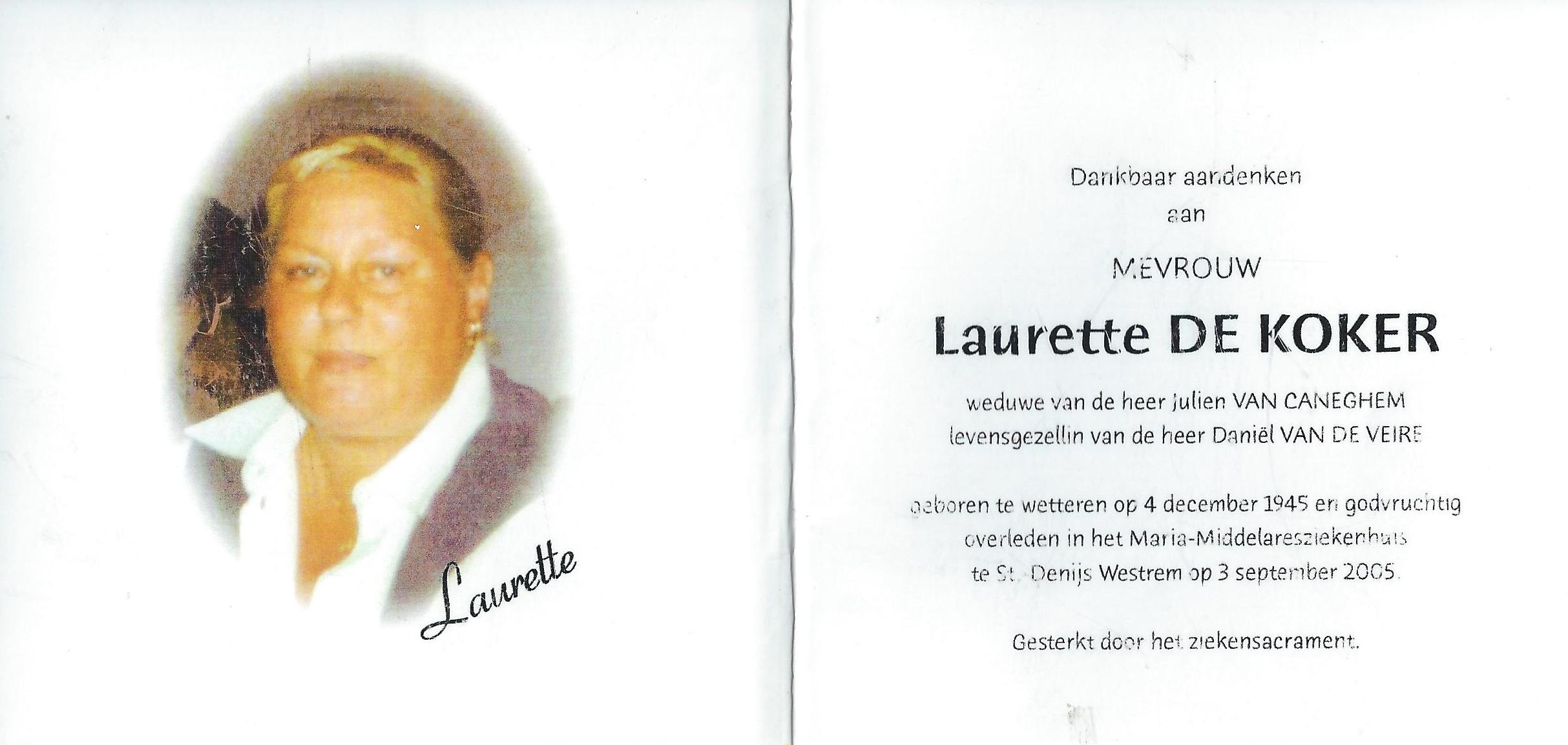 Laurette De Koker Geboren: 4 december 1945 — Wetteren Overleden: 3 september 2005 — Sint-Denijs-Westrem |