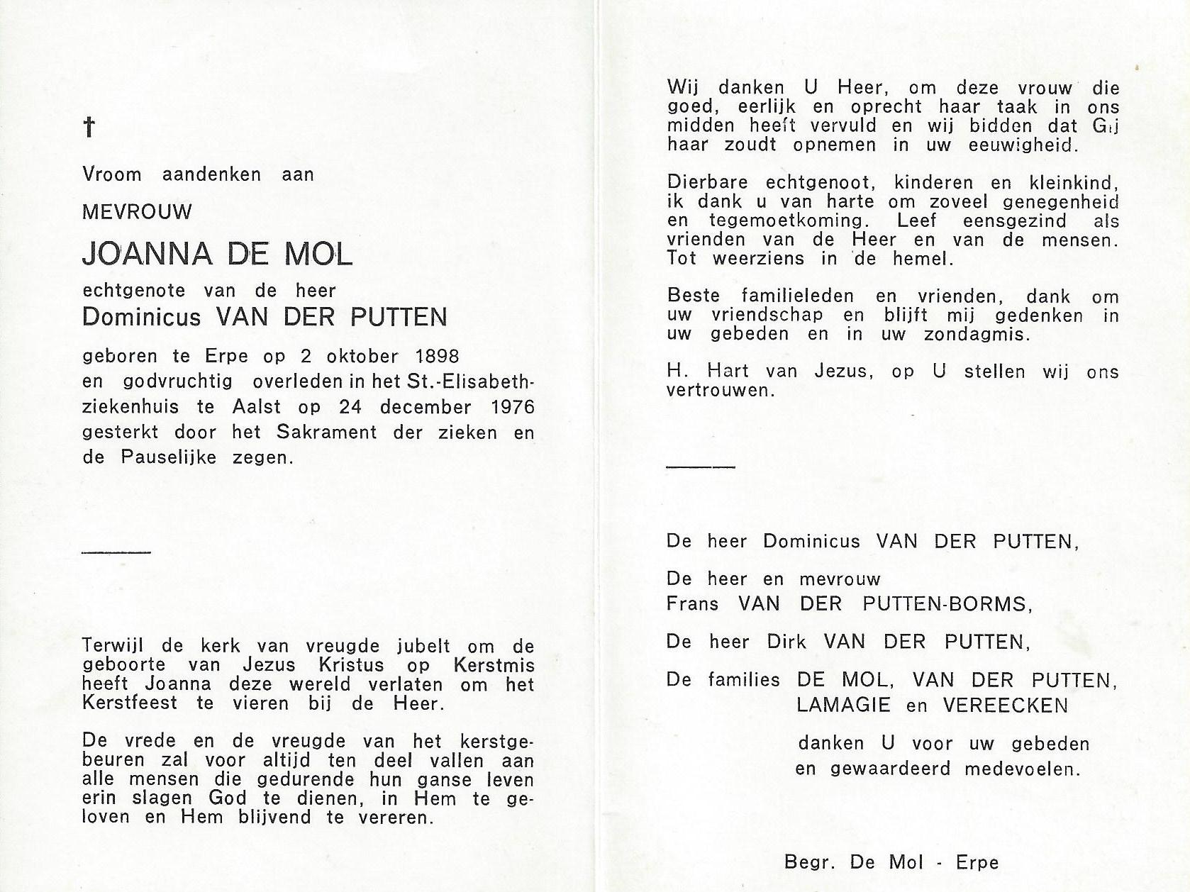 Overlijden van grootmoeder van vaders kant | Joanna De Mol 24 december 1976 (Leeftijd 20 jaar) |